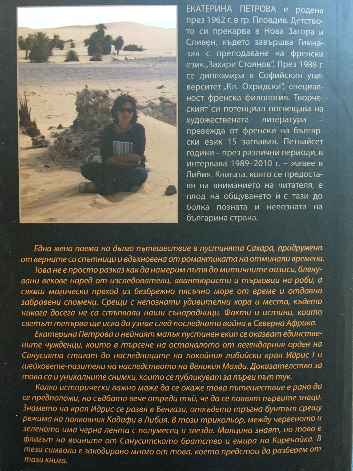 Една жена поема на дълго пътешествие в пустинята Сахара, придружена от верните си спътници и вдъхновена от романтиката на отминали времена. Това не е просто разказ как да намерим пътя до митичните оазиси, бленувани векове наред от изследователи, авантюристи и търговци на роби, а сякаш магически преход из безбрежно пясъчно море от време и отдавна забравени спомени. Срещи с непознати удивителни хора и места, където никога досега не са стъпвали наши сънародници. Факти и истини, които светът тепърва ще иска да узнае след последната война в Северна Африка, Екатерина Петрова и нейният малък пустинен екип се оказват единствените чужденци, които в търсене на останалото от легендарния орден на Санусията стигат до наследниците на покойния либийски крал Идрис I и шейховете-пазители на наследството на Великия Махди. Доказателство за това са и уникалните снимки, които се публикуват за първи път тук. Колко исторически важно може да се окаже това пътешествие е рано да се предположи, но съдбата вече отреди тъй, че да се появят първите знаци. Знамето на крал Идрис се развя в Бенгази, откъдето тръгна бунтът срещу режима на полковник Кадафи в Либия. В този трикольор, между червеното и зеленото има черна лента с полумесец и звезда. Малцина знаят, но това е флагът на воините от Сануситското братство и емира на Киренайка. В тези символи е закодирано много от това, което предстои да разберем от тази книга. ЕКАТЕРИНА ПЕТРОВА е родена през 1962 г. в гр. Пловдив. Детството си прекарва в Нова Загора и Сливен, където завършва Гимназия с преподаване на френски език„3ахари Стоянов". През 1988 г. се дипломира в Софийския университет,,^. Охридски", специалност френска филология. Творческият си потенциал посвещава на художествената литература превежда от френски на български език 15 заглавия. Петнайсет години - през различни периоди, в интервала 1989-2010 г. - живее в Либия. Книгата, която се предоставя на вниманието на читателя, е плод на общуването й с тази до болка позната и непозната на българина страна.