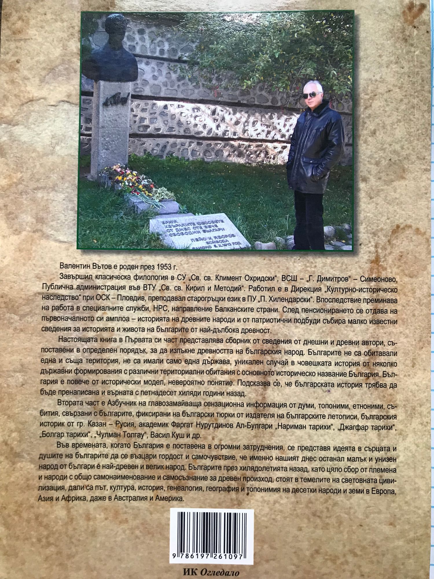 Валентин Вътов е роден през 1953 г. Завършил Класическа филология в СУ „Св. св. Климент Охридски", ВСШ - „Г. Димитров" - Симеоново, Публична администрация във ВТУ „Св. св. Кирил и Методий". Започва работа в Дирекция „Културно-историческо наследство" при ОСК - Пловдив, преподава старогръцки език в ПУ „П. Хилендарски". Впоследствие преминава на работа в специалните служби, НРС, направление Гърция и Балканските страни. След пенсионирането се отдава на първоначалното си амплоа - историята на древните народи и от патриотични подбуди събира малко известни сведения за историята и живота на българите от най-дълбока древност. Настоящата книга в Първата си част представлява сборник от сведения от днешни и древни автори, съпоставени в определен порядък, за да изпъкне древността на българския народ. Българите не са обитавали една и съща територия, не са имали само една държава, уникален случай в човешката история от няколко държавни образувания с различни териториални обитания с основното историческо название България. България е повече от исторически модел, невероятно понятие. Подсказва се, че българската история трябва да бъде пренаписана и върната с петнадесет хиляди години назад. Втората част е Азбучник на главозамайваща сензационна информация от думи, топоними, ет-ноними, събития, свързани с българите, фиксирани на български тюрки в книгите на големия български историк от гр. Казан, Русия, академик Фаргат Нурутдинов ал-Булгари „Нариман тарихи", „Джагфар тарихи", „Болгар тарихи", „Чулман Толгау" и др. Във времената, когато България е поставена в огромни затруднения, се представя идеята в сърцата и душите на българите да се възцари гордост и самочувствие, че именно нашият днес останал малък и унизен народ от българи е най-древен и велик народ. Българите през хилядолетията назад, като цяло сбор от племена и народи с общо самонаименувание и самосъзнание за древен произход, стоят в темелите на световната цивилизация, дали са път, култура, история, генеалогия, география и топонимия на десетки народи и земи в Европа, Азия и Африка, даже и Америка.