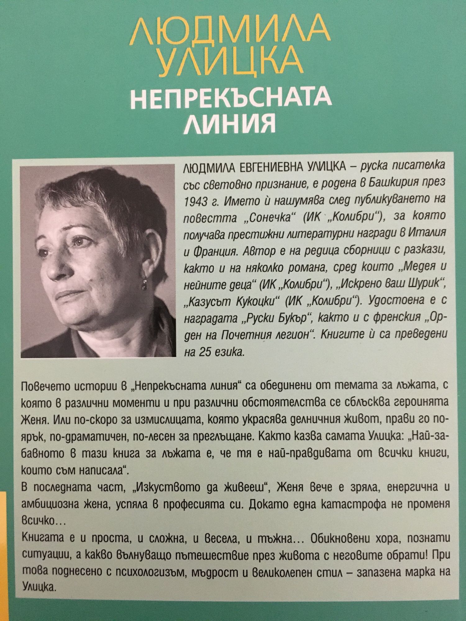 Повечето истории в „Непрекъсната линия“ са обединени от темата за лъжата, с която в различни моменти и при различни обстоятелства се сблъсква героинята Женя. Или по-скоро за измислицата, която украсява делничния живот, прави го по-ярък, по-драматичен, по-лесен за преглъщане. Както казва самата Улицка: „Най-забавното в тази книга за лъжата е, че тя е най-правдивата от всички книги, които съм написала“. В последната част, „Изкуството да живееш“, Женя вече е зряла, енергична и амбициозна жена, успяла в професията си. Докато една катастрофа не променя всичко… Книгата е и проста, и сложна, и весела, и тъжна… Обикновени хора, познати ситуации, а какво вълнуващо пътешествие през живота с неговите обрати! При това поднесено с психологизъм, мъдрост и великолепен стил – запазена марка на Улицка.