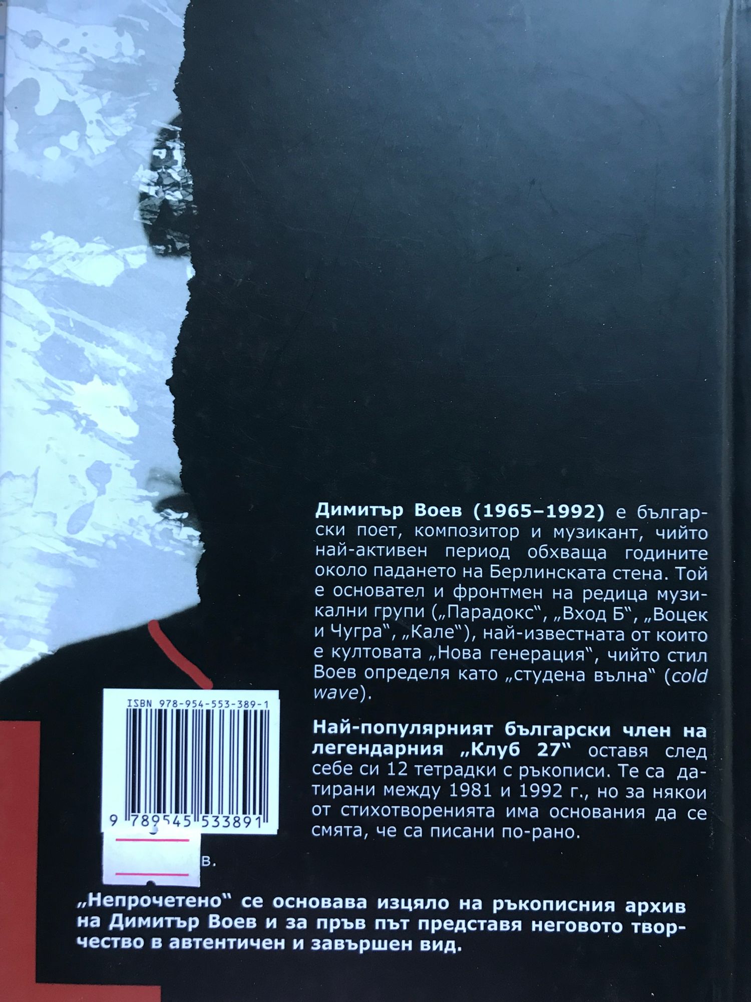 Димитър Воев (1965–1992) e български поет, композитор и музикант, чийто най-активен период обхваща годините около падането на Берлинската стена. Той е основател и фронтмен на редица музикални групи („Парадокс“, „Вход Б“, „Воцек и Чугра“, „Кале“), най-известната от които е култовата „Нова генерация“, чийто стил Воев определя като „студена вълна“ (cold wave). Най-популярният български член на легендарния „Клуб 27“ оставя след себе си 12 тетрадки с ръкописи. Те са датирани между 1981 и 1992 г., но за някои от стихотворенията има основания да се смята, че са писани по-рано. „Непрочетено“ се основава изцяло на ръкописния архив на Димитър Воев и за пръв път представя неговото творчество в автентичен и завършен вид.
