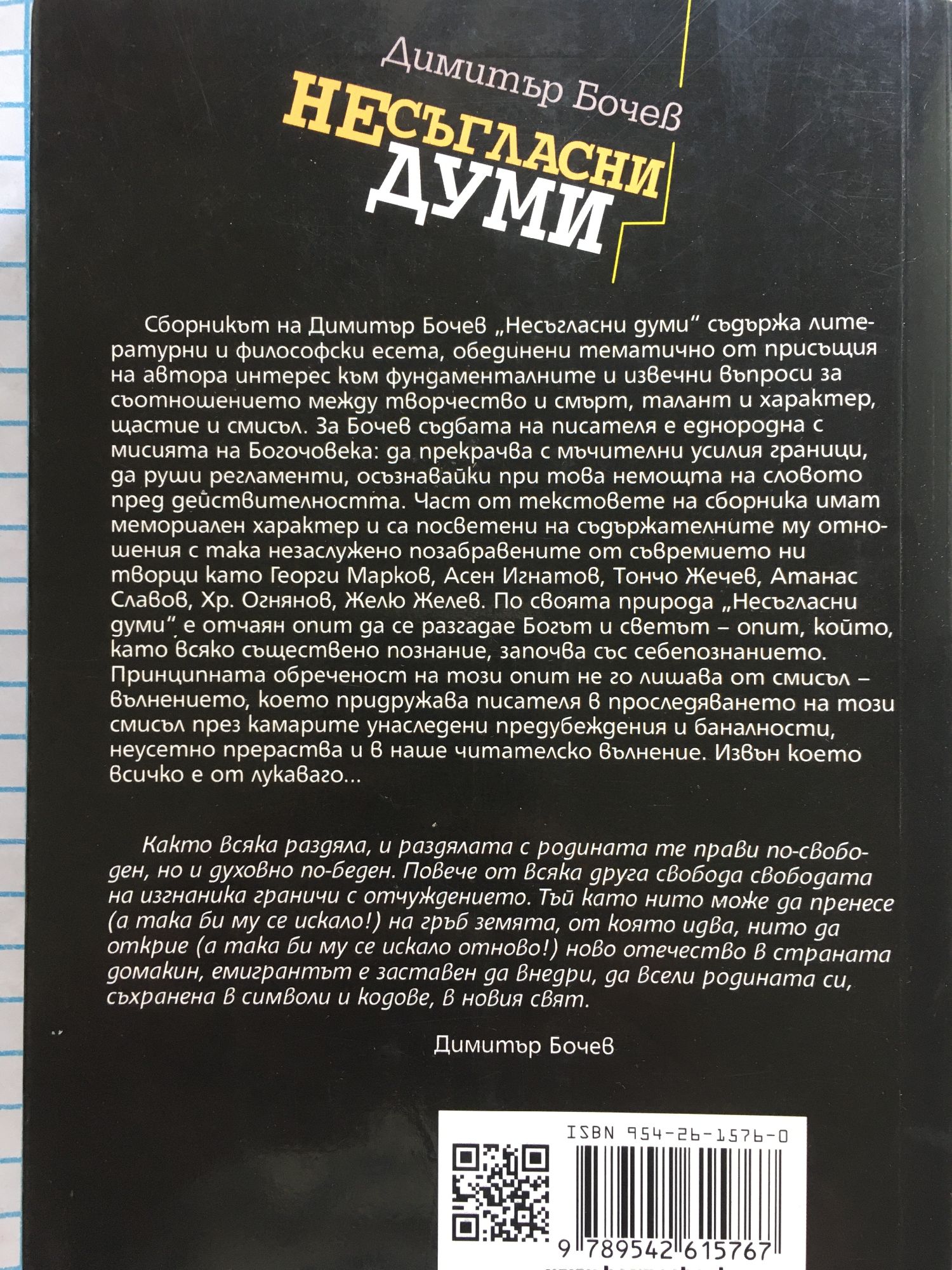 Сборникът на Димитър Бочев „Несъгласни думи“ съдържа литературни и философски есета, обединени тематично от присъщия на автора интерес към фундаменталните и извечни въпроси за съотношението между творчество и смърт, талант и характер, щастие и смисъл. За Бочев съдбата на писателя е еднородна с мисията на Богочовека: да прекрачва с мъчителни усилия граници, да руши регламенти, осъзнавайки при това немощта на словото пред действителността. Част от текстовете на сборника имат мемориален характер и са посветени на съдържателните му отношения с така незаслужено позабравените от съвремието ни творци като Георги Марков, Асен Игнатов, Тончо Жечев, Атанас Славов, Хр. Огнянов, Желю Желев. По своята природа „Несъгласни думи“ е отчаян опит да се разгадае Богът и светът – опит, който, като всяко съществено познание, започва със себепознанието. Принципната обреченост на този опит не го лишава от смисъл – вълнението, което придружава писателя в проследяването на този смисъл през камарите унаследени предубеждения и баналности, неусетно прераства и в наше читателско вълнение. Извън което всичко е от лукавого...
