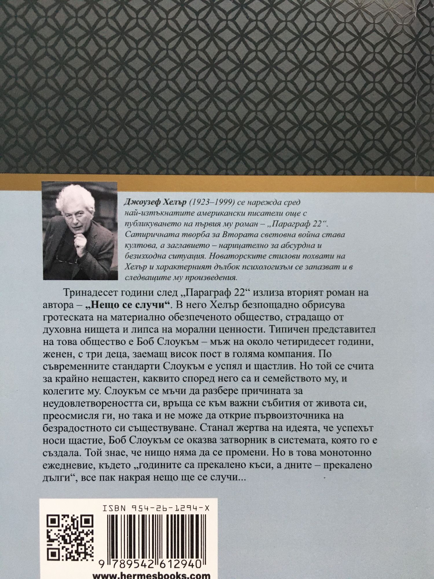 Джоузеф Хелър (1923–1999) се нарежда сред най-изтъкнатите американски писатели още с публикуването на първия му роман – „Параграф 22“. Сатиричната творба за Втората световна война става култова, а заглавието – нарицателно за абсурдна и безизходна ситуация. Новаторските стилови похвати на Хелър и характерният дълбок психологизъм се запазват и в следващите му произведения. Тринадесет години след „Параграф 22“ излиза вторият роман на автора – „Нещо се случи“. В него Хелър безпощадно обрисува гротеската на материално обезпеченото общество, страдащо от духовна нищета и липса на морални ценности. Типичен представител на това общество е Боб Слоукъм – мъж на около четиридесет години, женен, с три деца, заемащ висок пост в голяма компания. По съвременните стандарти Слоукъм е успял и щастлив. Но той се счита за крайно нещастен, каквито според него са и семейството му, и колегите му. Слоукъм се мъчи да разбере причината за неудовлетвореността си, връща се към важни събития от живота си, преосмисля ги, но така и не може да открие първоизточника на безрадостното си съществуване. Станал жертва на идеята, че успехът носи щастие, Боб Слоукъм се оказва затворник в системата, която го е създала. Той знае, че нищо няма да се промени. Но в това монотонно ежедневие, където „годините са прекалено къси, а дните – прекалено дълги“, все пак накрая нещо ще се случи...