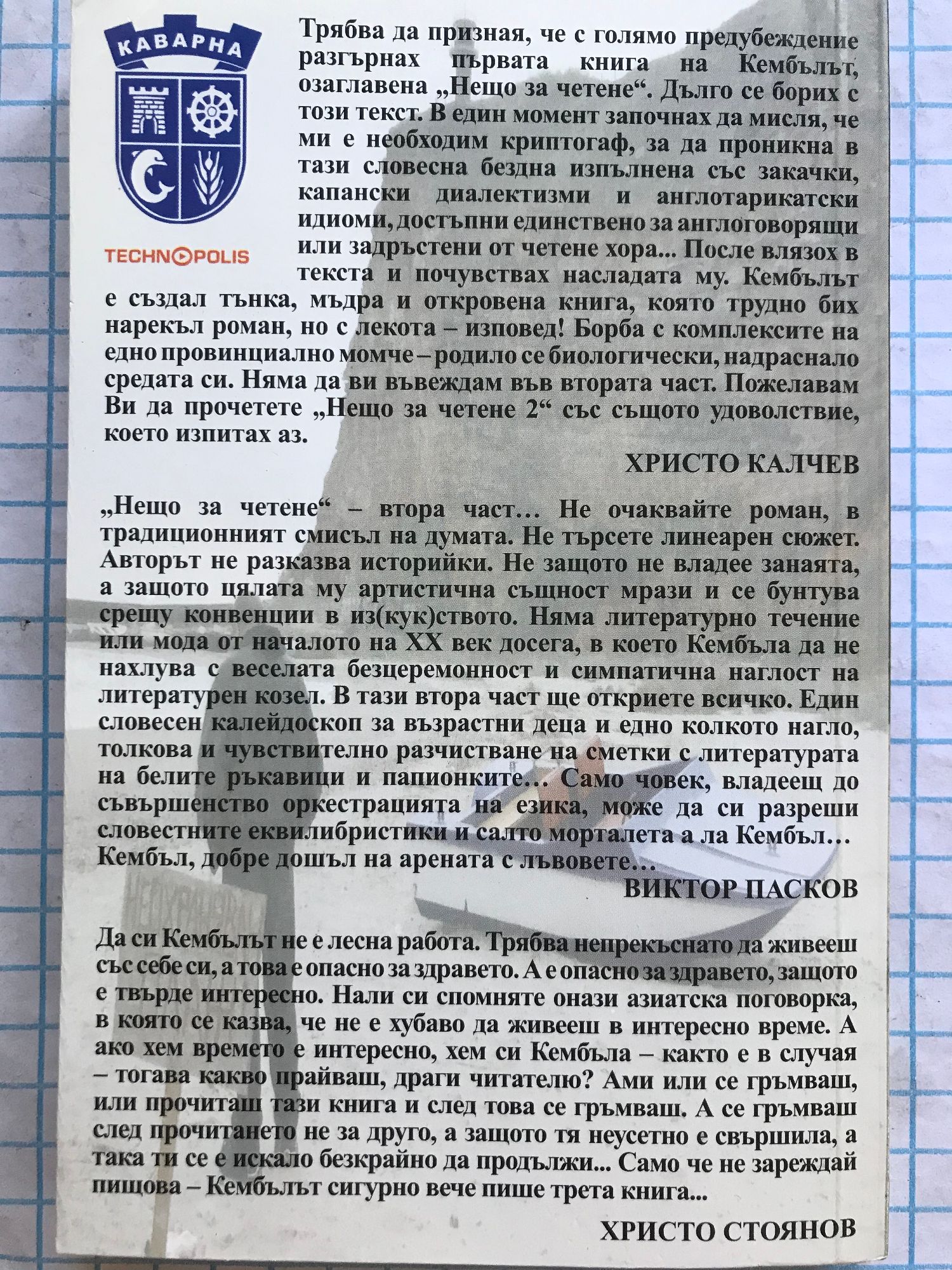 Здравейте, приятели! Бих искал да ви кажа две неща, но не като издател на книгата, а като читател. 1. Когато четете тази книга, забравете за Кембъла! Забравете за това което сте чували, виждали или знаете за него! Четете и се наслаждавайте на разказа му! И вие и хората около вас - просто няма начин да не им разказвате! Няма начин да не споделите впечатленията си от книгата! Няма начин да не се познаете в някои от случките! Няма начин да не познаете някои от героите! НЯМА НАЧИН!!! 2. Когато четете тази книга, НЕзабравяйте кой е Кембъла! Не забравяйте за неговата колоритност, емоционалност, начетеност и интелигентност! Забравете правилата на писаното слово! Слушайте разказа му! Забравете за точки, запетайки, тирета и други "излишни" канони! Представете си въздишки, жестикулации, гримаси, преглъщания, примлясвания и други такива! Огледайте се! Той е до вас! И ви говори! Споделя! Откровено! Само с вас! ПРЕВЪРНЕТЕ ЧЕТЕНЕТО - В СЛУШАНЕ!!! Всички имена, места и случки в книгата са истински, но едновременно с това са събирателни за повече от половината българи. Поне за мен е така. Кембъла е описал своите детски вълнения, войнишки неволи, приятелски "подвизи", любовни трепети, радости и несгоди в живота, но те са и мои! Това е и моят живот! Това, сигурен съм, е и вашият живот! Сигурен съм и в друго - аз пред себе си не съм бил толкова откровен, колкото е Кембъла пред нас. Както би го написал той - всичко е 1 към 1. Кембълче, шапка ти свалям за способността да намираш най-точните и силни думи, когато искаш да кажеш нещо. За способността ти да използваш цялото богатство на българският език, а освен това да го и допълваш с нови, твои думи. На моменти дори ти завиждам за тази ти дарба! Но благородно и безобидно! Приятно четене приятели! ИВИЛИН ИВАНОВ