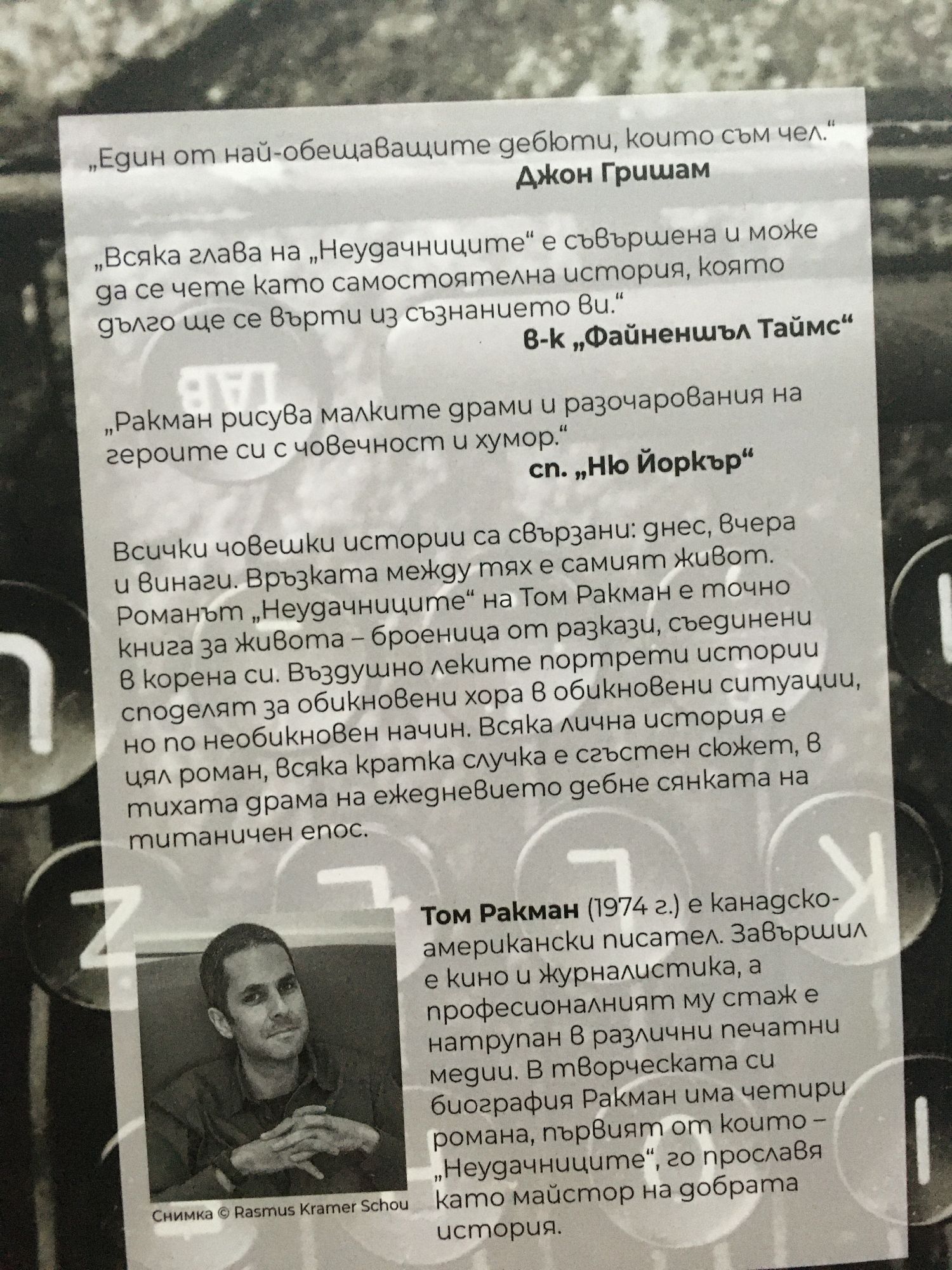 „Един от най-обещаващите дебюти, които съм чел.“ – Джон Гришам „Всяка глава на „Неудачниците“ е съвършена и може да се чете като самостоятелна история, която дълго ще се върти из съзнанието ви.“ – в. „Файненшъл Таймс“ „Ракмaн рисува малките драми и разочарования на героите си с човечност и хумор.“ – сп. „Ню Йоркър“ Всички човешки истории са свързани: днес, вчера и винаги. Връзката между тях е самият живот. Романът „Неудачниците“ на Том Ракман е точно книга за живота – броеница от разкази, съединени в корена си. Въздушно леките портрети истории споделят за обикновени хора в обикновени ситуации, но по необикновен начин. Всяка лична история е цял роман, всяка кратка случка е сгъстен сюжет, в тихата драма на ежедневието дебне сянката на титаничен епос. Том Ракман (1974 г.) е канадско-американски писател. Завършил е кино и журналистика, а професионалният му стаж е натрупан в различни печатни медии. В творческата си биография Ракман има четири романа, първият от които – „Неудачниците“, го прославя като майстор на добрата история.