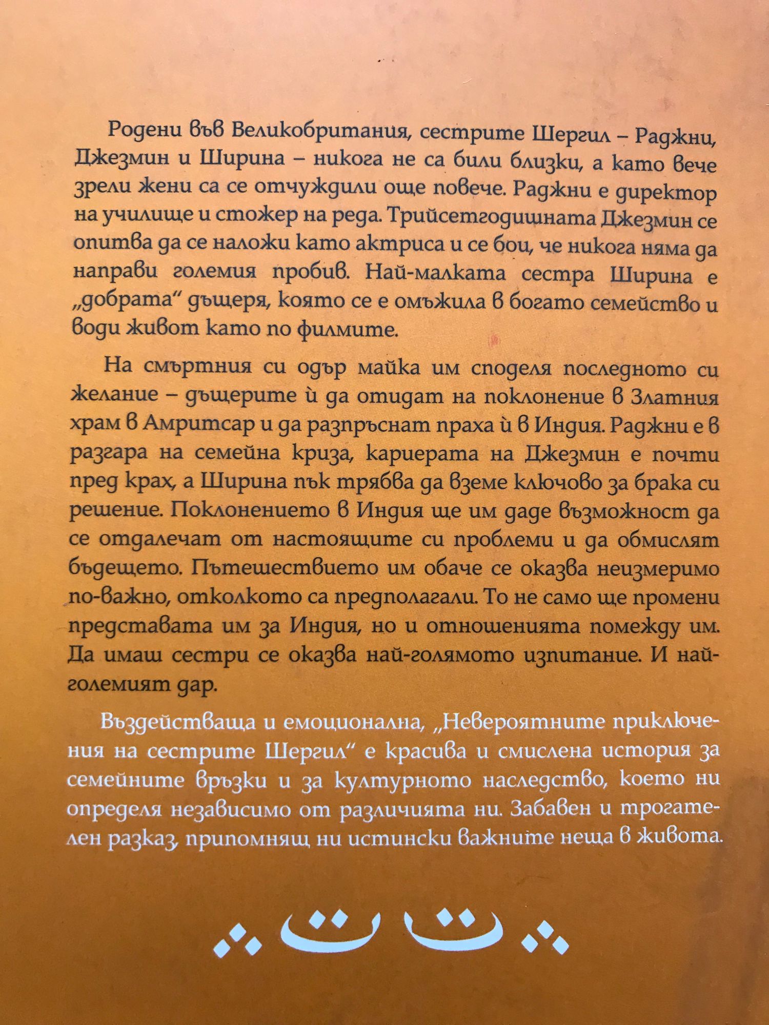 Родени във Великобритания, сестрите Шергил – Раджни, Джезмин и Ширина – никога не са били близки, а като вече зрели жени са се отчуждили още повече. Раджни е директор на училище и стожер на реда. Трийсетгодишната Джезмин се опитва да се наложи като актриса и се бои, че никога няма да направи големия пробив. Най-малката сестра Ширина е „добрата“ дъщеря, която се е омъжила в богато семейство и води живот като по филмите. На смъртния си одър майка им споделя последното си желание – дъщерите й да отидат на поклонение в Златния храм в Амритсар и да разпръснат праха й в Индия. Раджни е в разгара на семейна криза, кариерата на Джезмин е почти пред крах, а Ширина пък трябва да вземе ключово за брака си решение. Поклонението в Индия ще им даде възможност да се отдалечат от настоящите си проблеми и да обмислят бъдещето. Пътешествието им обаче се оказва неизмеримо по-важно, отколкото са предполагали. То не само ще промени представата им за Индия, но и отношенията помежду им. Да имаш сестри, се оказва най-голямото изпитание. И най-големият дар. Въздействаща и емоционална, „Невероятните приключения на сестрите Шергил“ е красива и смислена история за семейните връзки и за културното наследство, което ни определя независимо от различията ни. Забавен и трогателен разказ, припомнящ ни истински важните неща в живота.