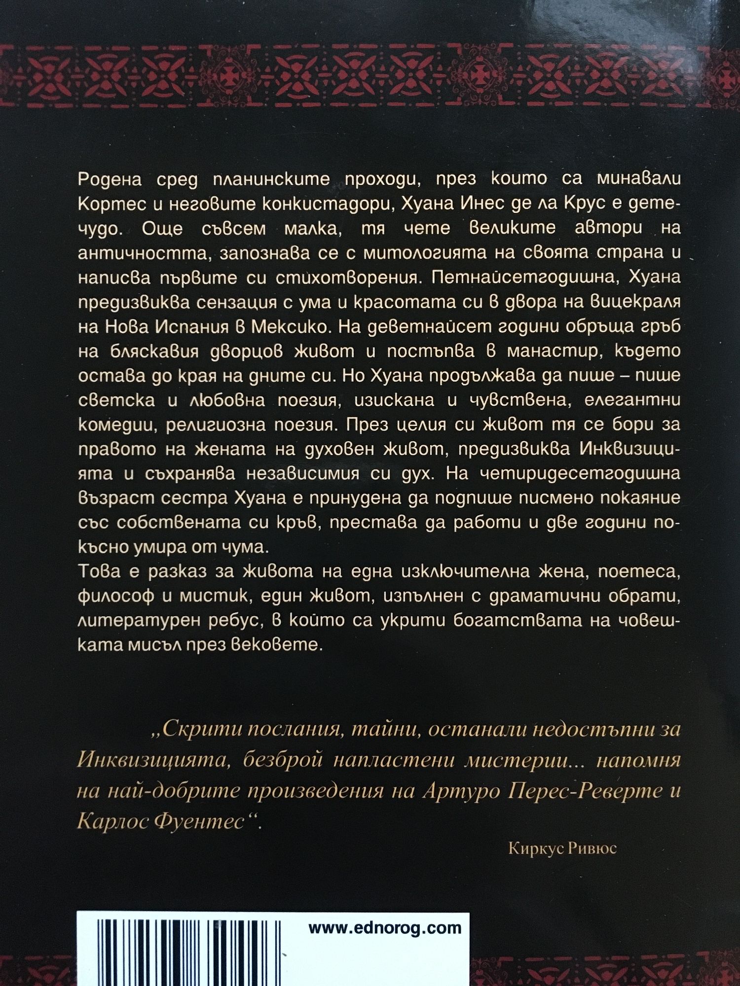Родена сред планинските проходи, през които са минавали Кортес и неговите конкистадори, Хуана Инес де ла Крус е дете-чудо. Още съвсем малка, тя чете великите автори на античността, запознава се с митологията на своята страна и написва първите си стихотворения. Петнайсетгодишна, Хуана предизвиква сензация с ума и красотата си в двора на вицекраля на Нова Испания в Мексико. На деветнайсет години обръща гръб на бляскавия дворцов живот и постъпва в манастир, където остава до края на дните си. Но Хуана продължава да пише – пише светска и любовна поезия, изискана и чувствена, елегантни комедии, религиозна поезия. През целия си живот тя се бори за правото на жената на духовен живот, предизвиква Инквизицията и съхранява независимия си дух. На четиридесетгодишна възраст сестра Хуана е принудена да подпише писмено покаяние със собствената си кръв, престава да работи и две години по-късно умира от чума. Това е разказ за живота на една изключителна жена, поетеса, философ и мистик, един живот, изпълнен с драматични обрати, литературен ребус, в който са укрити богатствата на човешката мисъл през вековете.