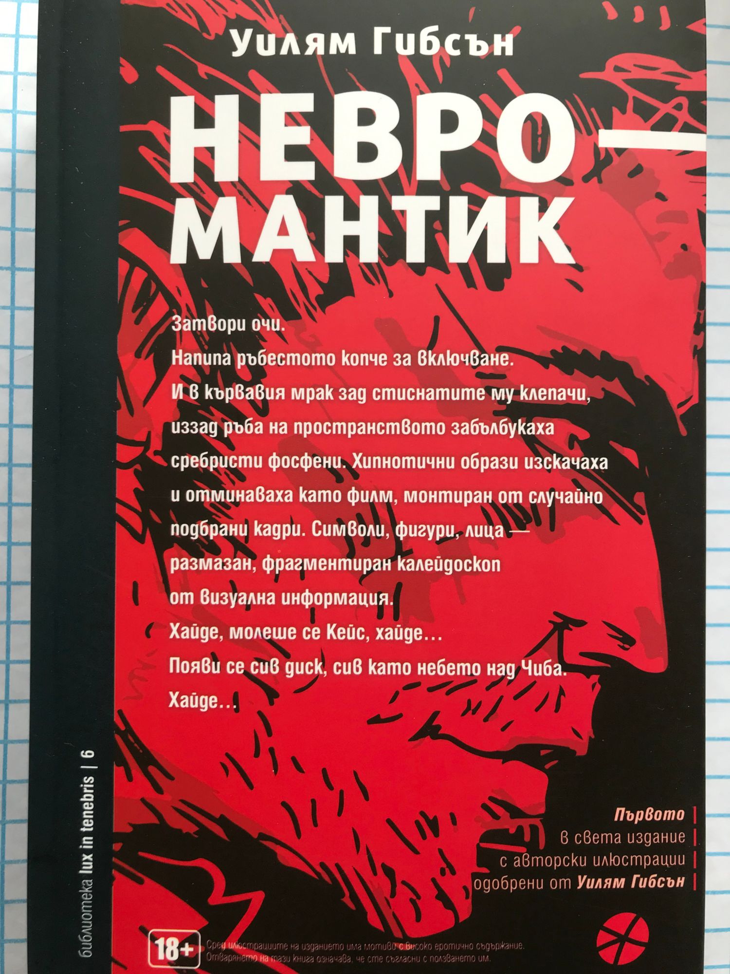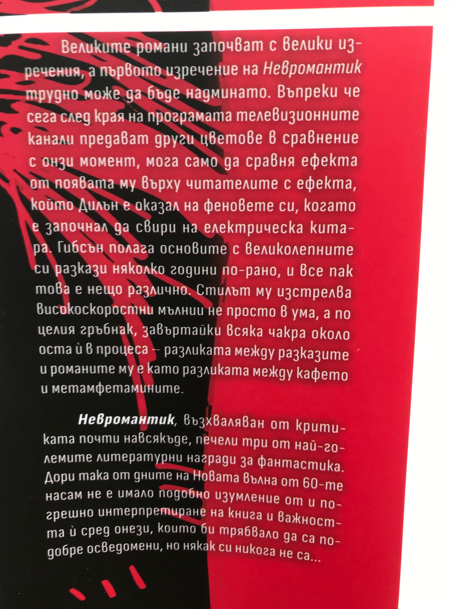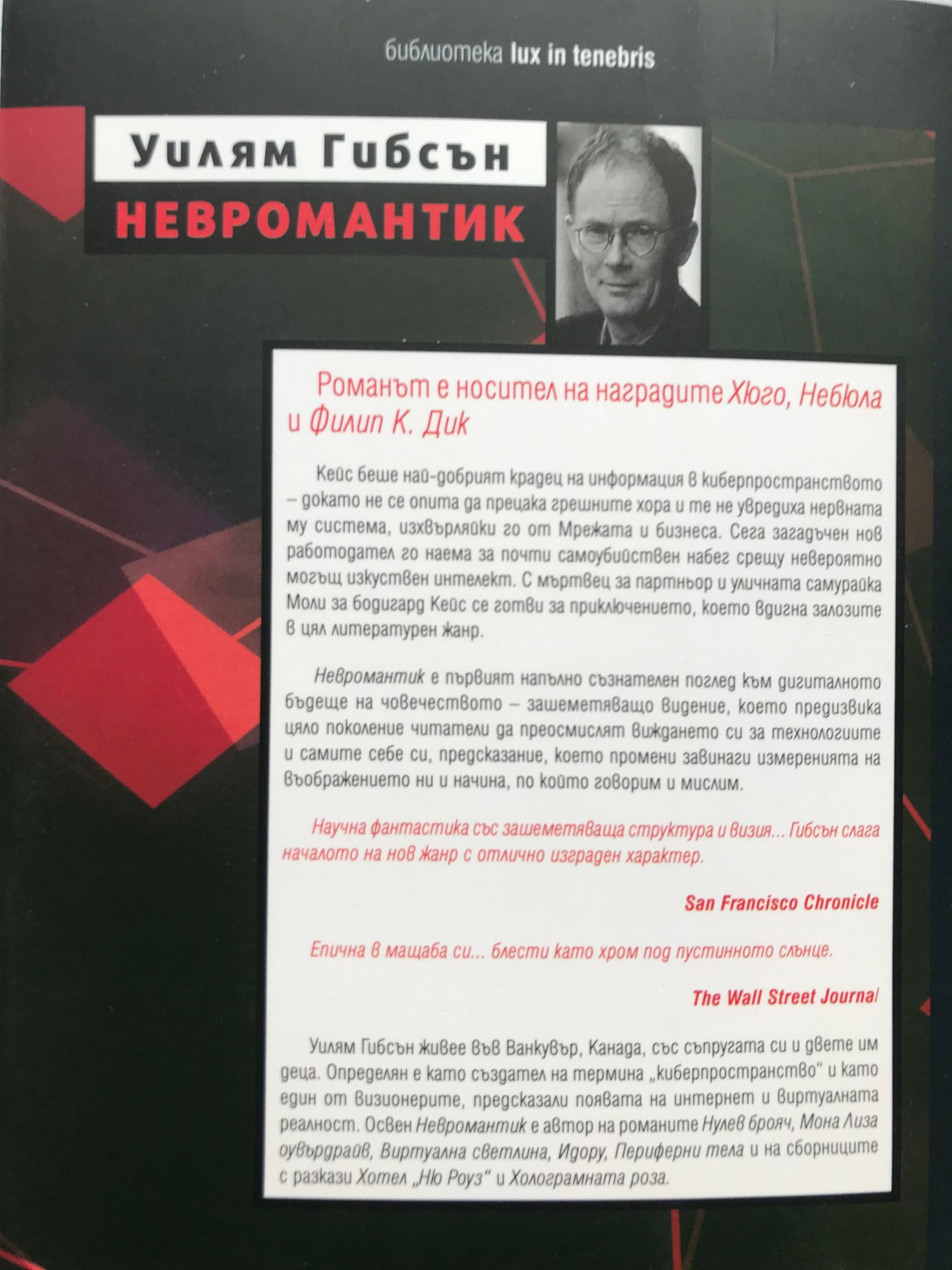 Кейс беше най-добрият крадец на информация в киберпространството – докато не се опита да прецака грешните хора и те не увредиха нервната му система, изхвърляйки го от Мрежата и бизнеса. Сега загадъчен нов работодател го наема за почти самоубийствен набег срещу невероятно могъщ изкуствен интелект. С мъртвец за партньор и уличната самурайка Моли за бодигард Кейс се готви за приключението, което вдигна залозите в цял литературен жанр. Невромантик е първият напълно съзнателен поглед към дигиталното бъдеще на човечеството – зашеметяващо видение, което предизвика цяло поколение читатели да преосмислят виждането си за технологиите и самите себе си, предсказание, което промени завинаги измеренията на въображението ни и начина по който говорим и мислим. "Научна фантастика със зашеметяваща структура и визия… Гибсън слага началото на нов жанр с отлично изграден характер." San Francisco Chronicle "Епична в мащаба си… блести като хром под пустинното слънце.?" The Wall Street Journal Уилям Гибсън живее във Ванкувър, Канада, със съпругата си и двете им деца. Определян е като създател на термина „киберпространство” и като един от визионерите, предсказали появата на интернет и виртуалната реалност. Освен Невромантик е автор на романите Нулев брояч, Мона Лиза оувърдраи, виртуална светлина, Идору, Периферни тела и на сборниците с разкази Хотел „Ню Роуз” и Холограмната роза.