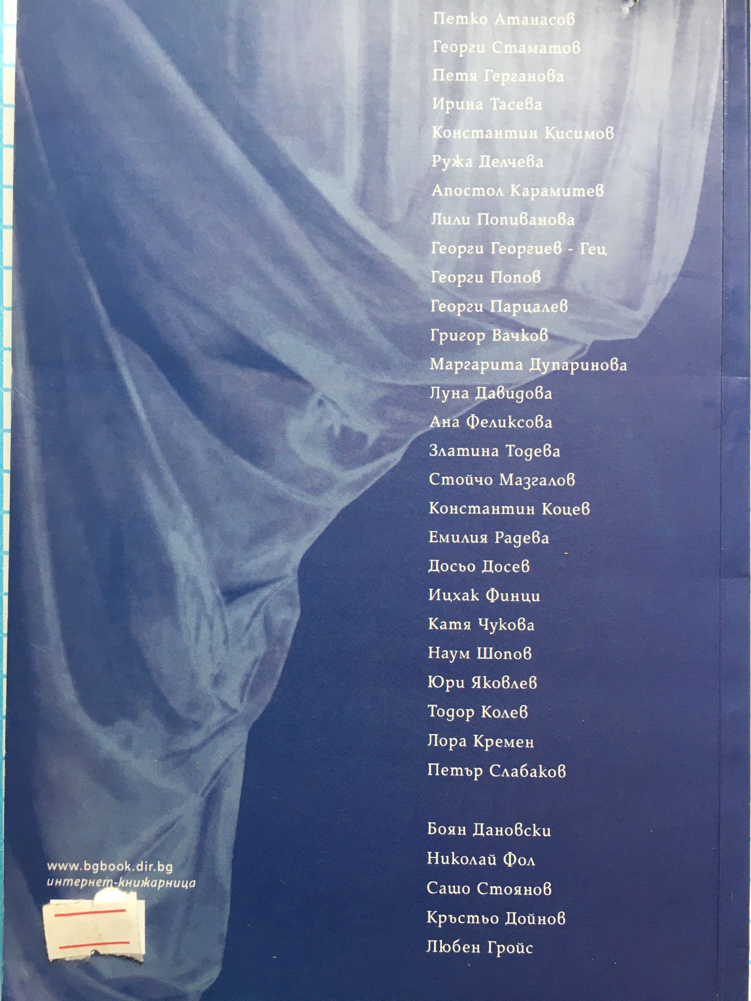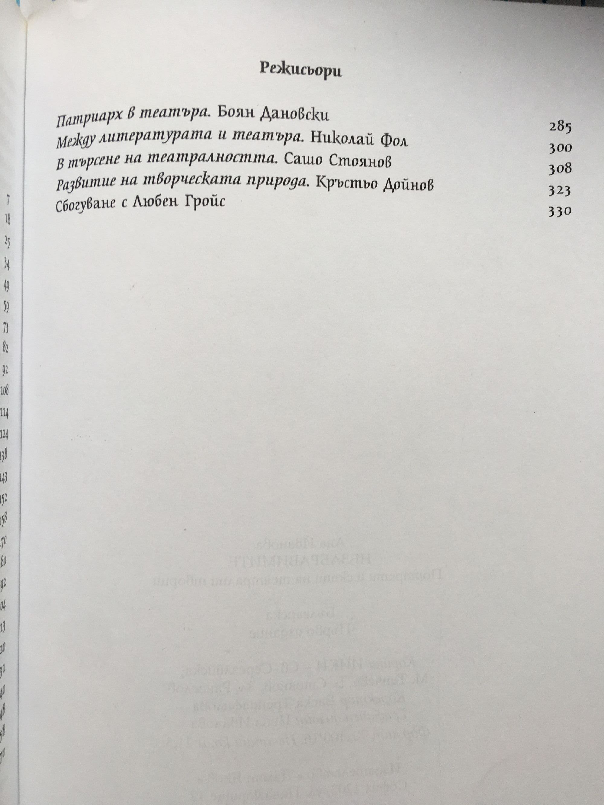 В книгата са включени: Петко Атанасов, Георги Стаматов, Петя Герганова, Ирина Тасева, Константин Кисимов, Ружа Делчева, Апостол Карамитев, Лили Попиванова, Георги Георгиев - Гец, Георги Попов, Георги Парцалев, Григор Вачков, Маргарита Дупаринова, Луна Давидова, Ана Феликсова, Златина Тодева, Стойчо Мъзгалов, Константин Коцев, Емилия Радева, Досьо Досев, Ицхак Финци, Катя Чукова, Наум Шопов, Юри Яковлев, Тодор Колев, Лора Кремен, Петър Слабаков, Боян Дановски, Николай Фол, Сашо Стоянов, Кръстьо Дойнов, Любен Гройс.