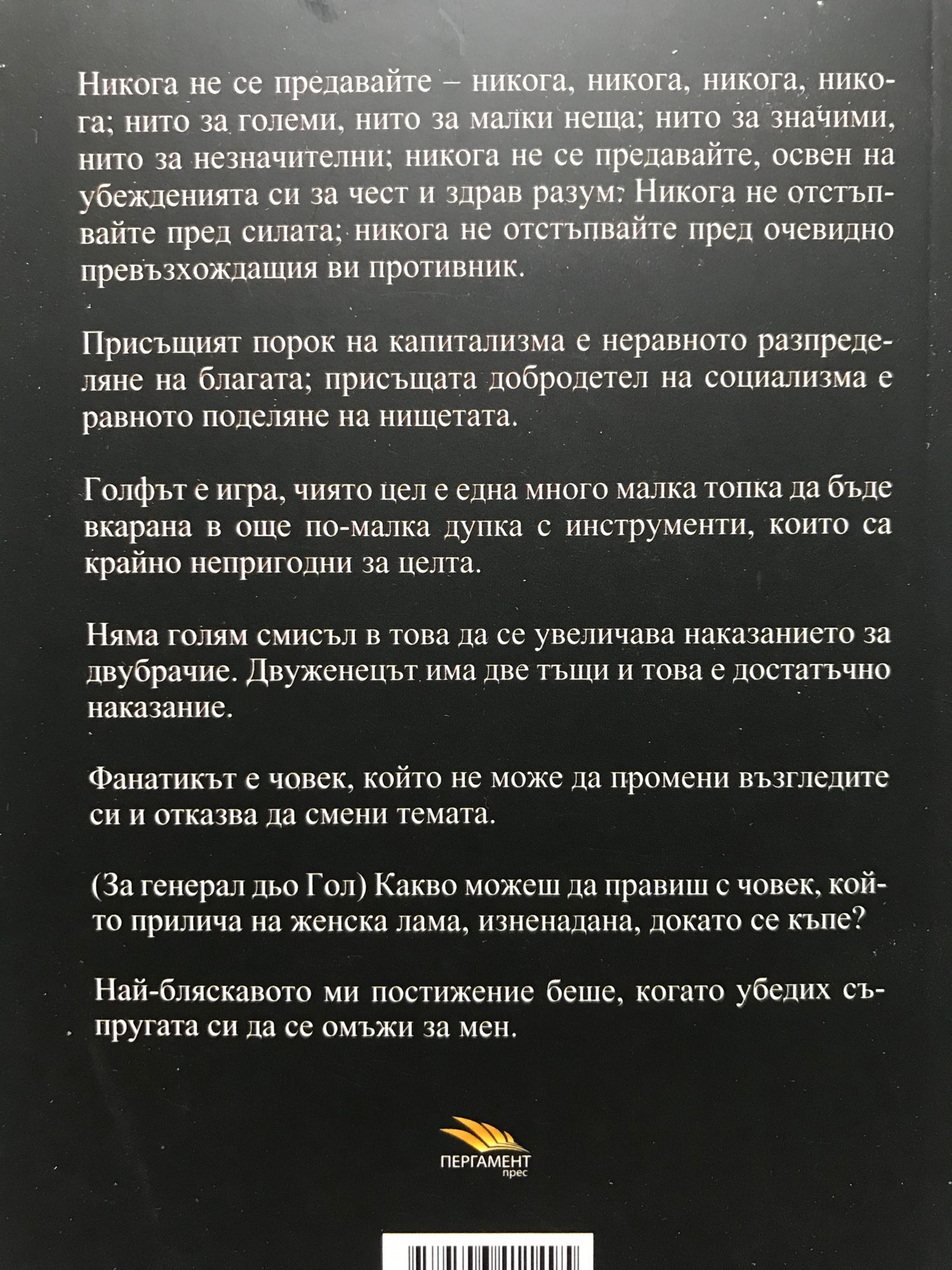 Никога не се предавайте – никога, никога, никога, никога; нито за големи, нито за малки неща; нито за значими, нито за незначителни; никога не се предавайте, освен на убежденията си за чест и здрав разум. Никога не отстъпвайте пред силата; никога не отстъпвайте пред очевидно превъзхождащия ви противник. Присъщият порок на капитализма е неравното разпределяне на благата; присъщата добродетел на социализма е равното поделяне на нищетата. Голфът е игра, чиято цел е една много малка топка да бъде вкарана в още по-малка дупка с инструменти, които са крайно непригодни за целта. Няма голям смисъл в това да се увеличава наказанието за двубрачие. Двуженецът има две тъщи и това е достатъчно наказание. Фанатикът е човек, който не може да промени възгледите си и отказва да смени темата. (За генерал дьо Гол) Какво можеш да правиш с човек, който прилича на женска лама, изненадана, докато се къпе? Най-бляскавото ми постижение беше, когато убедих съпругата си да се омъжи за мен.