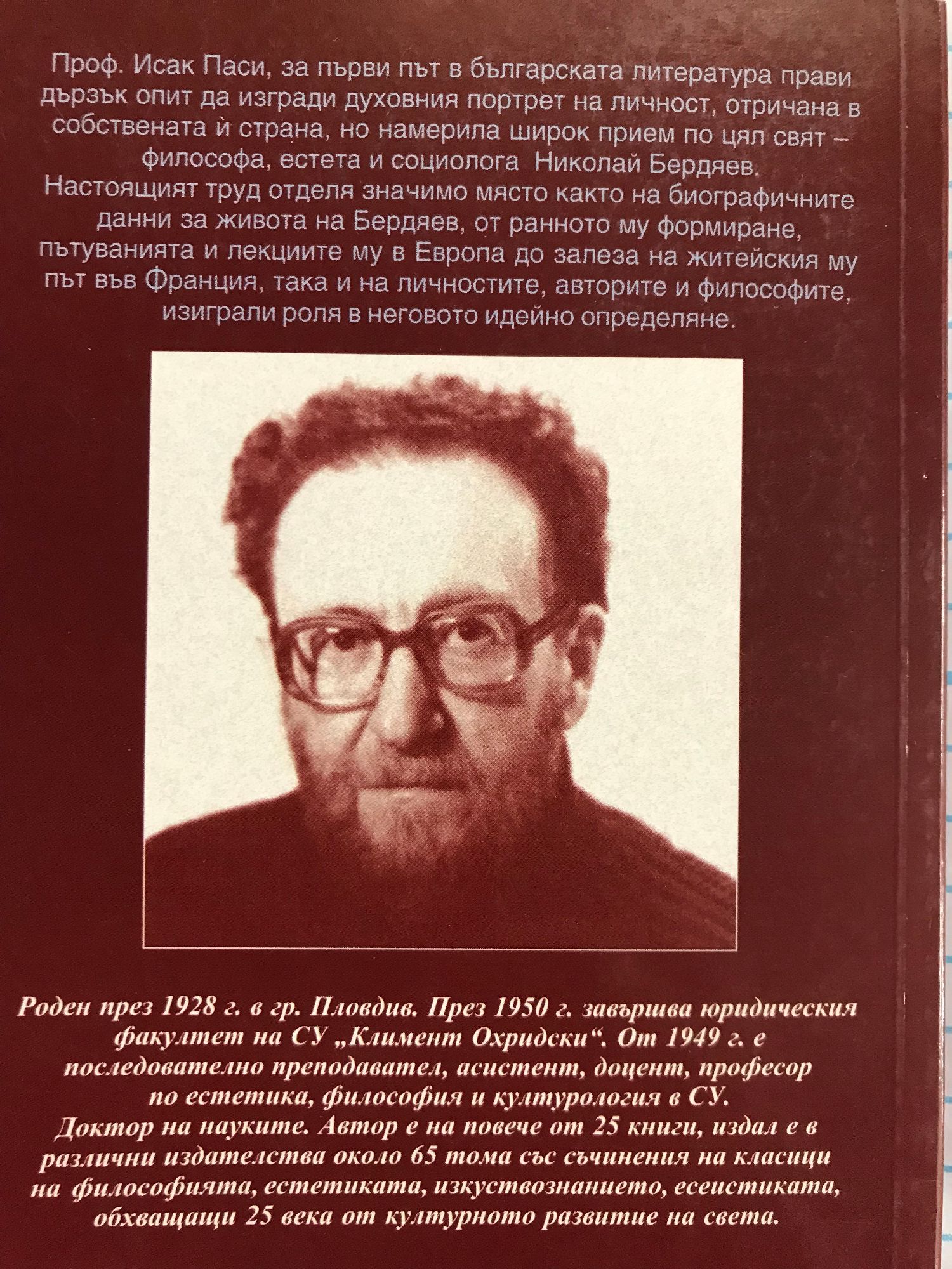 За Бердяев е наистина трудно да се каже какво е той повече, в коя област неговият талант се изразява по-силно: във философията (онтологията и гносеологията), в етиката, в социологията, в политологията или във философската антропология. Всички науки за човека (но не като природно, а като социално същество) привличат неговото внимание и във всички като че ли еднакво топ проявява своето дарование. И ако има цялостна наука за човека, която именно поради своята комплексност може да се нарече хуманистика, несъмнено Бердяев е хуманитарист раr excellence. Проф. Исак Паси, за първи път в българската литература прави дързък опит да изгради духовния портрет на личност, отричана в собствената й страна, но намерила широк прием по цял свят - философа, естета и социолога Николай Бердяев. Настоящият труд отделя значимо място както на биографичните данни за живота на Бердяев, от ранното му формиране, пътуванията и лекциите му в Европа до залеза на житейския му път във Франция, така и на личностите, авторите и философите, изиграли роля в неговото идейно определяне.