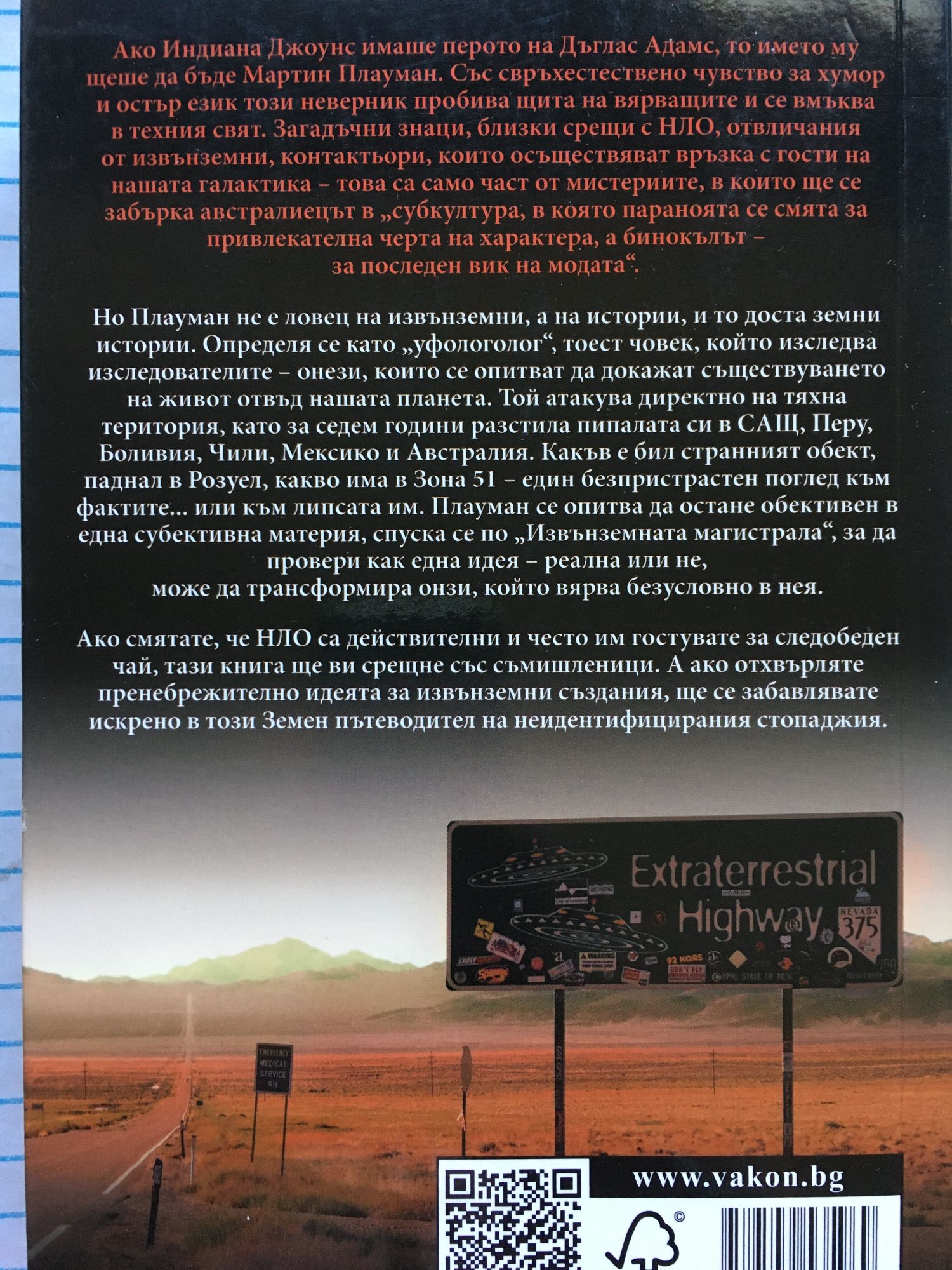 Ако Индиана Джоунс имаше перото на Дъглас Адамс, то името му щеше да бъде Мартин Плауман. Със свръхестествено чувство за хумор и остър език този неверник пробива щита на вярващите и се вмъква в техния свят. Загадъчни знаци, близки срещи с НЛО, отвличания от извънземни, контактьори, които осъществяват връзка с гости на нашата галактика - това са само част от мистериите, в които ще се забърка австралиецът в "субкултура, в която параноята се смята за привлекателна черта на характера, а бинокълът - за последен вик на модата". Но Плауман не е ловец на извънземни, а на истории, и то доста земни истории. Определя се като "уфолог", тоест човек, който изследва изследователите - онези, които се опитват да докажат съществуването на живот отвъд нашата планета. Той атакува директно на тяхна територия, като за седем години разстила пипалата си в САЩ, Перу, Боливия, Чили, Мексико и Австралия. Какъв е бил странният обект, паднал в Розуел, какво има в Зона 51 - един безпристрастен поглед към фактите... или към липсата им. Плауман се опитва да остане обективен в една субективна материя, спуска се по "Извънземната магистрала", за да провери как една идея - реална или не, може да трансформира онзи, който вярва безусловно в нея. Ако смятате, че НЛО са действителни и често им гостувате за следобеден чай, тази книга ще ви срещне със съмишленици. А ако отхвърляте пренебрежително идеята за извънземни създания, ще се забавлявате искрено в този Земен пътеводител на неидентифицирания стопаджия.