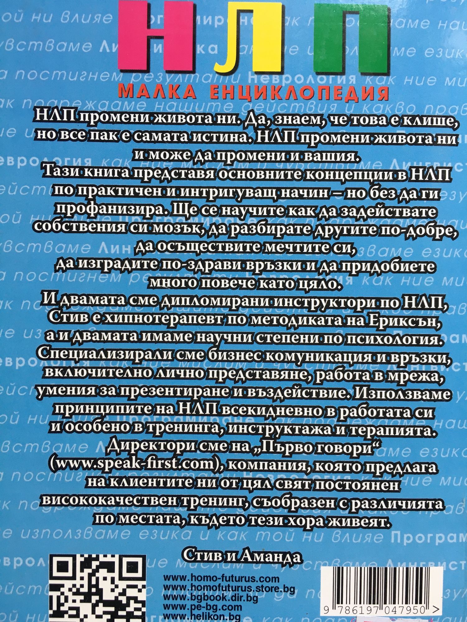 "НЛП промени живота ни. Да, знаем, че това е клише, но все пак е самата истина. НЛП промени живота ни и може да промени и вашия. Тази книга представя основните концепции в НЛП по практически и интригуващ начин - но без да ги профанизира. Ще се научите как да задействате собствения си мозък, да разбирате другите по-добре, да осъществите мечтите си, да изградите по-здрави връзки и да придобиете много повече като цяло. И двамата сме дипломирани инструктори по НЛП, Стив е хипнотерапевт по методиката на Ериксън, а и двамата имаме научни степени по психология. Специализирали сме бизнес комуникация и връзки, включително лично представяне, работа в мрежа, умения за презентиране и въздействие. Използваме принципите на НЛП всекидневно в работата си и особено в тренинга, инструктажа и терапията. Директори сме на "Първо говори", компания, която предлага на клиентите ни от цял свят постоянен висококачествен тренинг, съобразен с различията по местата, където тези хора живеят." Стив Бавистър, Аманда Викърс