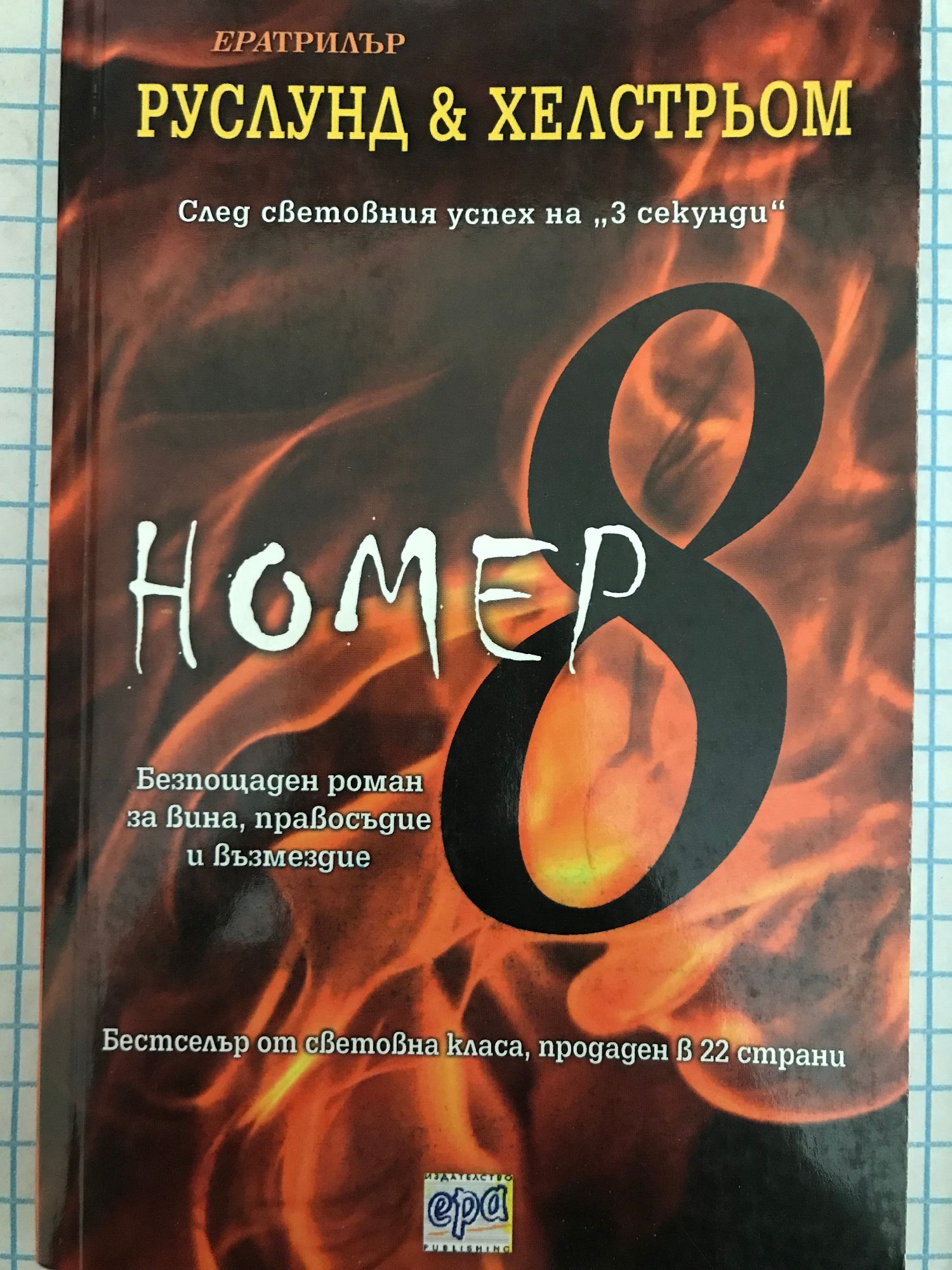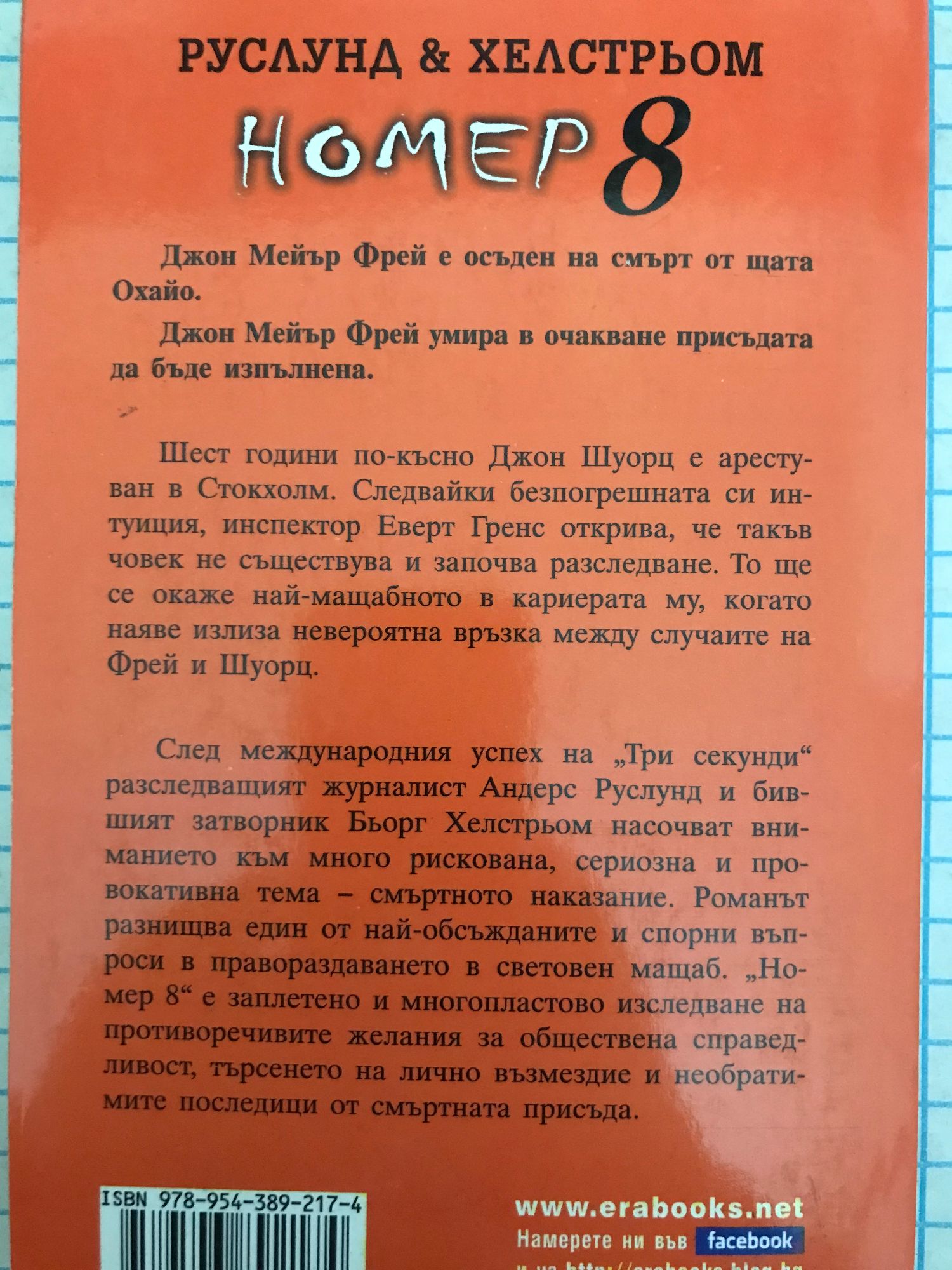 "Номер 8" безпощаден роман за вина, правосъдие и възмездие Бестселър от световна класа, продаден в 22 страни Джон Мейър Фрей е осъден на смърт от щата Охайо. Джон Мейър Фрей умира в очакване присъдата да бъде изпълнена. Шест години по-късно Джон Шуорц е арестуван в Стокхолм. Следвайки безпогрешната си интуиция, инспектор Еверт Гренс открива, че такъв човек не съществува и започва разследване. То ще се окаже най-мащабното в кариерата му, когато наяве излиза невероятна връзка между случаите на Фрей и Шуорц. След международния успех на "Три секунди" разследващият журналист Андерс Руслунд и бившият затворник Бьорг Хелстрьом насочват вниманието към много рискована, сериозна и провокативна тема - смъртното наказание. Романът разнищва един от най-обсъжданите и спорни въпроси в правораздаването в световен мащаб. "Номер 8" е заплетено и многопластово изследване на противоречивите желания за обществена справедливост, търсенето на лично възмездие и необратимите последици от смъртната присъда.