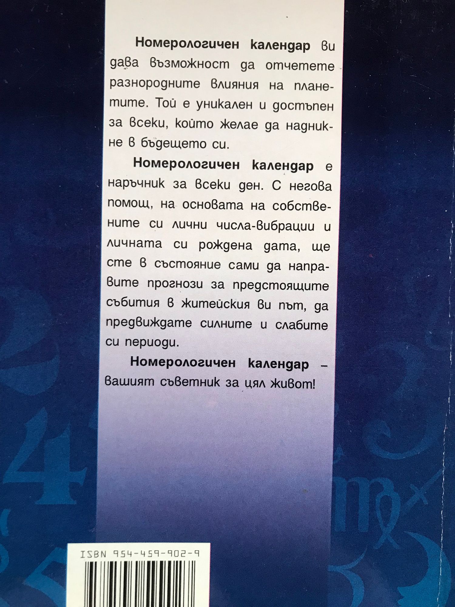 Номерологичен календар ви дава възможност да отчетете разнородните влияния на планетите. Той е уникален и достъпен за всеки, който желае да надникне в бъдещето си. Номерологичен календар е наръчник за всеки ден. С негова помощ, на основата на собствените си лични числа-вибрации и личната си рождена дата, ще сте в състояние сами да направите прогнози за предстоящите събития в житейския ви път, да предвиждате силните и слабите си периоди. Номерологичен календар вашият съветник за цял живот!