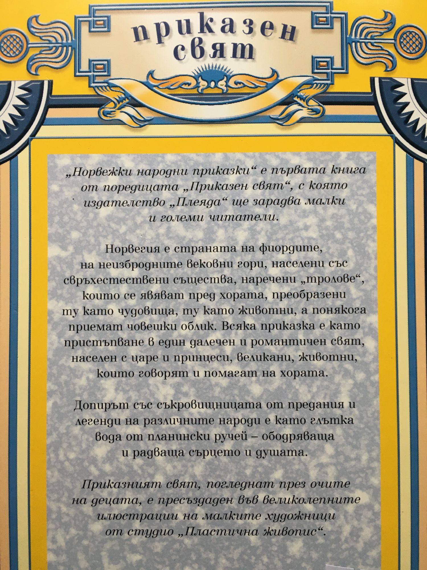 Норвегия е страната на фиордите, на неизбродните вековни гори, населени със свръхестествени същества, наречени "тролове", които се явяват пред хората, преобразени ту като чудовища, ту като животни, а понякога приемат човешки облик. Всяка приказка е като пристъпване в един далечен и романтичен свят, населен с царе и принцеси, великани, животни, които говорят и помагат на хората. Допирът със съкровищницата от предания и легенди на различните народи е като глътка вода от планински ручей - ободряваща и радваща сърцето и душата.