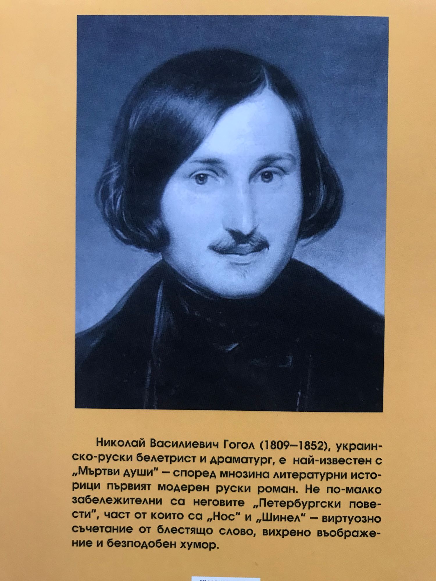 Николай Василиевич Гогол (1809-1852), украинско-руски белетрист и драматург, е най-известен с "Мъртви души" - според мнозина литературни историци първият модерен руски роман. Не по-малко забележителни са неговите "Петербургски повести", част от които са "Нос" и "Шинел" - виртуозно съчетание от блестящо слово, вихрено въображение и безподобен хумор.