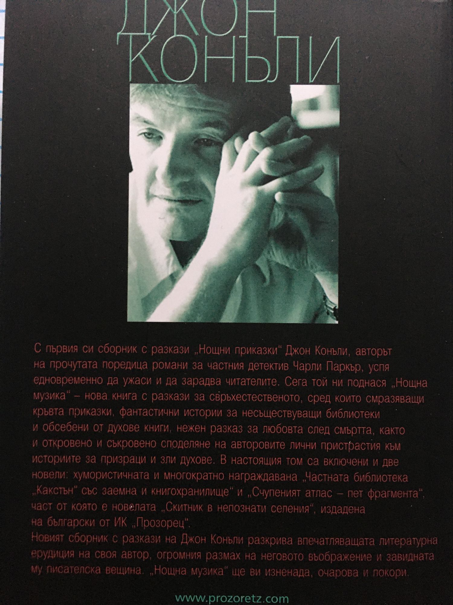 С първия си сборник с разкази „Нощни приказки“ Джон Конъли, авторът на прочутата поредица романи за частния детектив Чарли Паркър, успя едновременно да ужаси и да зарадва читателите. Сега той ни поднася „Нощна музика“ – нова книга с разкази за свръхестественото, сред които смразяващи кръвта приказки, фантастични истории за несъществуващи библиотеки и обсебени от духове книги, нежен разказ за любовта след смъртта, както и откровено и съкровено споделяне на авторовите лични пристрастия към историите за призраци и зли духове. В настоящия том са включени и две новели: хумористичната и многократно награждавана „Частната библиотека „Какстън“ със заемна и книгохранилище“ и „Счупеният атлас – пет фрагмента“, част от която е новелата „Скитник в непознати селения“, издадена на български от ИК „Прозорец“. Новият сборник с разкази на Джон Конъли разкрива впечатляващата литературна ерудиция на своя автор, огромния размах на неговото въображение и завидната му писателска вещина. „Нощна музика“ ще ви изненада, очарова и покори.