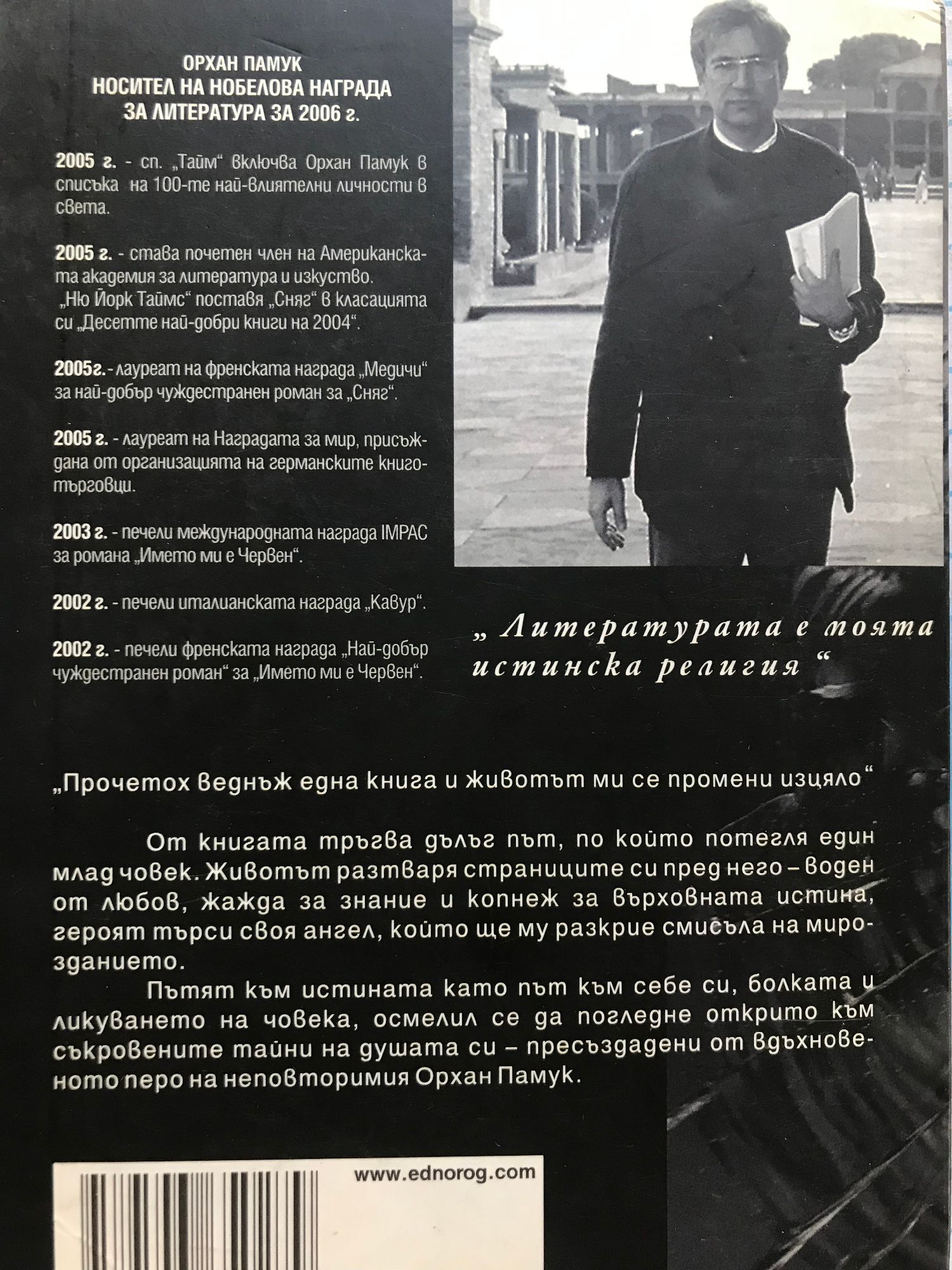 "Прочетох веднъж една книга и животът ми се промени изцяло". От книгата тръгва дълъг път, по който потегля един млад човек. Животът разтваря страниците си пред него – воден от любов, жажда за знание и копнеж за върховната истина, героят търси своя ангел, който ще му разкрие смисъла на мирозданието. Пътят към истината като път към себе си, болката и ликуването на човека, осмелил се да погледне открито към съкровените тайни на душата си – пресъздадени от вдъхновеното перо на неповторимия Орхан Памук.