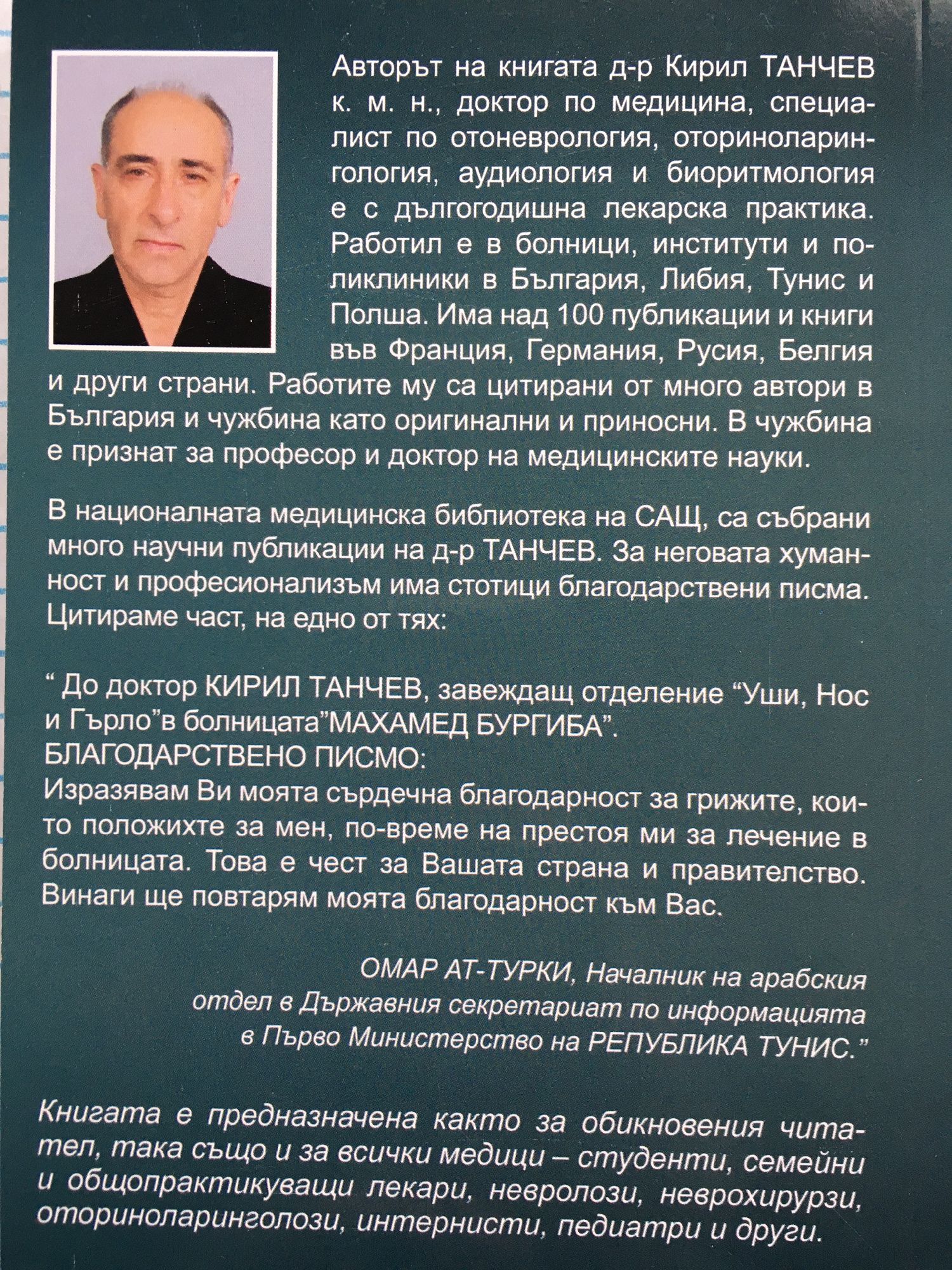 Авторът на книгата д-р Кирил ТАНЧЕВ к. м. н., доктор по медицина, специалист по отоневрология, оториноларин-гология, аудиология и биоритмология е с дългогодишна лекарска практика. Работил е в болници, институти и поликлиники в България, Либия, Тунис и Полша. Има над 100 публикации и книги във Франция, Германия, Русия, Белгия и други страни. Работите му са цитирани от много автори в България и чужбина като оригинални и приносни. В чужбина е признат за професор и доктор на медицинските науки. В националната медицинска библиотека на САЩ, са събрани много научни публикации на д-р ТАНЧЕВ. За неговата хуманност и професионализъм има стотици благодарствени писма. Цитираме част, на едно от тях: "До доктор КИРИЛ ТАНЧЕВ, завеждащ отделение "Уши, Нос и Гърло" в болницата "МАХАМЕД БУРГИБА". БЛАГОДАРСТВЕНО ПИСМО: Изразявам Ви моята сърдечна благодарност за грижите, които положихте за мен, по-време на престоя ми за лечение в болницата. Това е чест за Вашата страна и правителство. Винаги ще повтарям моята благодарност към Вас. ОМАР АТ-ТУРКИ, Началник на арабския отдел в Държавния секретариат по информацията в Първо Министерство на РЕПУБЛИКА ТУНИС." Книгата е предназначена както за обикновения читател, така също и за всички медици - студенти, семейни и общопрактикуващи лекари, невролози, неврохирурзи, оториноларинголози, интернисти, педиатри и други.