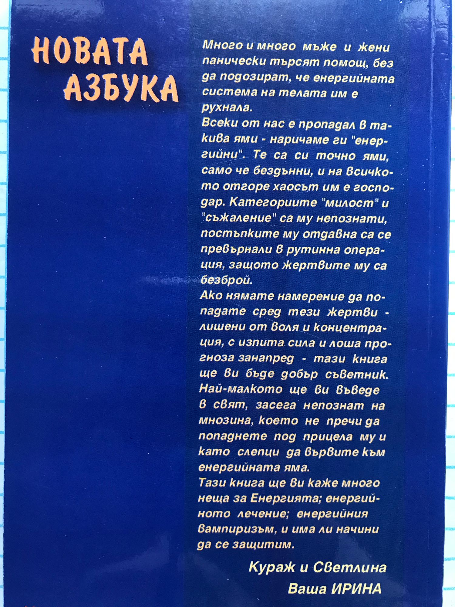 Много мъже и жени панически търсят помощ, без да подозират, че енергийната система на телата им е рухнала. Всеки от нас е пропадал в такива ями - наричаме ги "енергийни". Те са си точно ями, само че бездънни, и на всичкото отгоре хаосът им е господар. Категориите "милост" и "съжаление" са му непознати, постъпките му отдавна са се превърнали в рутинна операция, защото жертвите му са безброй. Ако нямате намерение да попадате сред тези жертви -лишени от воля и концентрация, с изпита сила и лоша прогноза занапред - тази книга ще ви бъде добър съветник. Най-малкото ще ви въведе в свят, засега непознат на мнозина, което не пречи да попаднете под прицела му и като слепци да вървите към енергийната яма. Тази книга ще ви каже много неща за Енергията; енергийното лечение; енергийния вампиризъм, и има ли начини да се защитим. ИРИНА