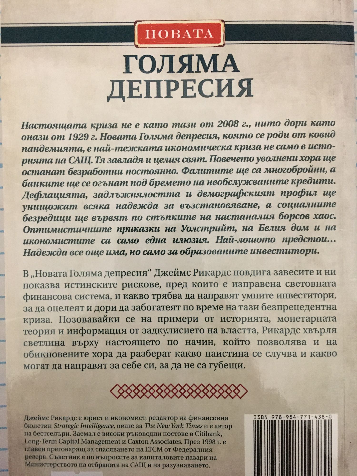 Настоящата криза не е като тази от 2008 г., нито дори като онази от 1929 г. Новата Голяма депресия, която се роди от ковид пандемията, е най-тежката икономическа криза не само в историята на САЩ. Тя завладя и целия свят. Повечето уволнени хора ще останат безработни постоянно. Фалитите ще са многобройни, а банките ще се огънат под бремето на необслужваните кредити. Дефлацията, задлъжнялостта и демографският профил ще унищожат всяка надежда за възстановяване, а социалните безредици ще вървят по стъпките на настаналия борсов хаос. Оптимистичните приказки на Уолстрийт, на Белия дом и на икономистите са само една илюзия. Най-лошото предстои... Надежда все още има, но само за образованите инвеститори. В "Новата Голяма депресия" Джеймс Рикардс повдига завесите и ни показва истинските рискове, пред които е изправена световната финансова система, и какво трябва да направят умните инвеститори, за да оцелеят и дори да забогатеят по време на тази безпрецедентна криза. Позовавайки се на примери от историята, монетарната теория и информация от задкулисието на властта, Рикардс хвърля светлина върху настоящето по начин, който позволява и на обикновените хора да разберат какво наистина се случва и какво могат да направят за себе си, за да не са губещи. Джеймс Рикардс е юрист и икономист, редактор на финансовия бюлетин "Strategic Intelligence", пише за "The New York Times" и е автор на бестселъри. Заемал е високи ръководни постове в "Citibank", "Long-Term Capital Management" и "Caxton Associates". През 1998 г. е главен преговарящ за спасяването на LTCM от Федералния резерв. Съветник е по въпросите за капиталовите пазари на Министерството на отбраната на САЩ и на разузнаването.
