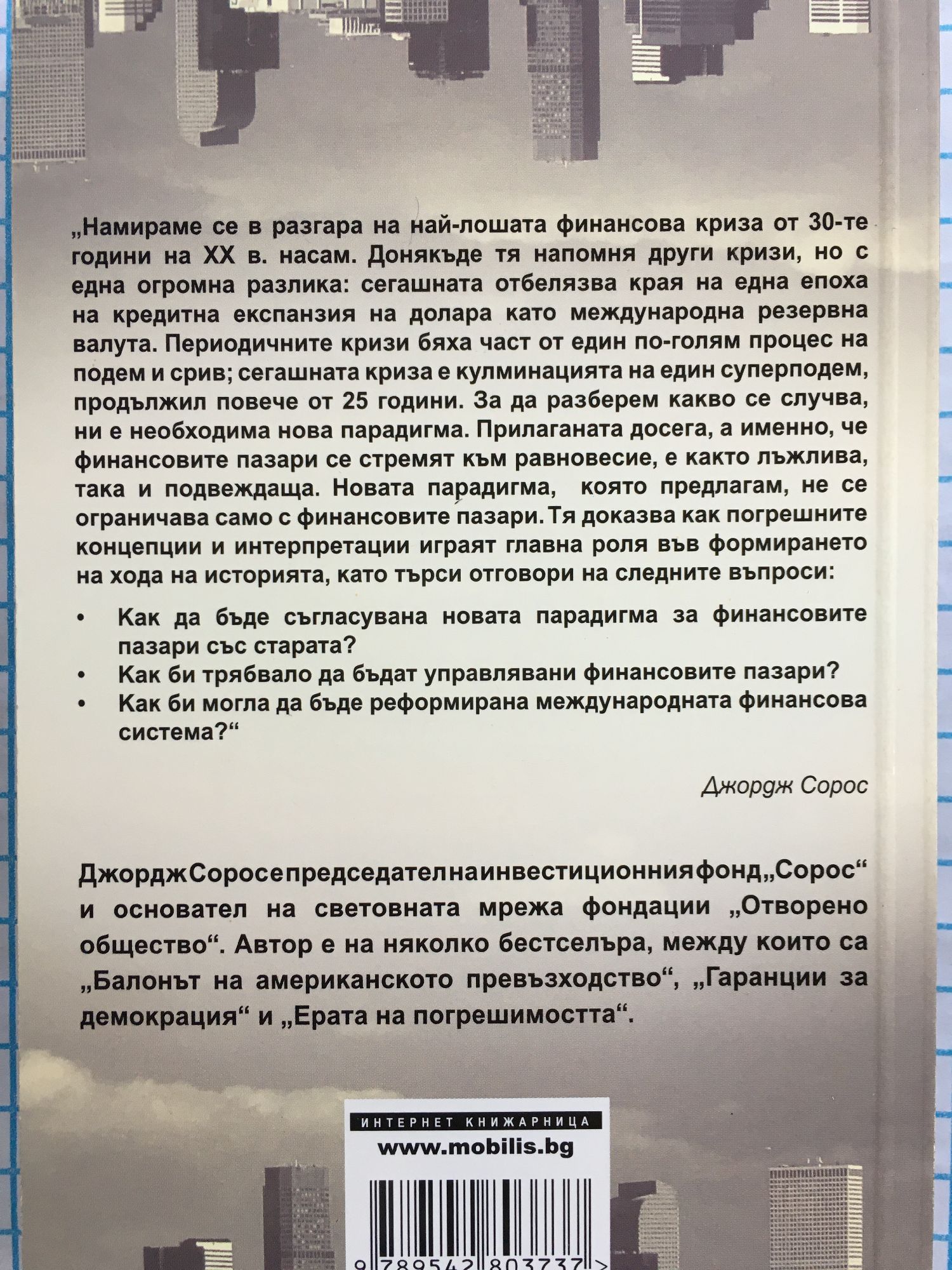 "Намираме се в разгара на най-лошата финансова криза от 30-те години на ХХ в. насам. Донякъде тя напомня други кризи, но с една огромна разлика: сегашната отбелязва края на една епоха на кредитна експанзия на долара като международна резервна валута. Периодичните кризи бяха част от един по-голям процес на подем и срив; сегашната криза е кулминацията на един суперподем, продължил повече от 25 години. За да разберем какво cе случва, ни е необходима нова парадигма. Прилаганата досега, а именно, че финансовите пазари се стремят към равновесие, е както лъжлива, така и подвеждаща. Новата парадигма, която предлагам, не се ограничава само с финансовите пазари. Tя доказва как погрешните концепции и интерпретации играят главна роля във формирането на хода на историята, като търси отговори на следните въпроси: • Как да бъде съгласувана новата парадигма за финансовите пазари със старата? • Как би трябвало да бъдат управлявани финансовите пазари? • Как би могла да бъде реформирана международната финансова система?" Джордж Сорос
