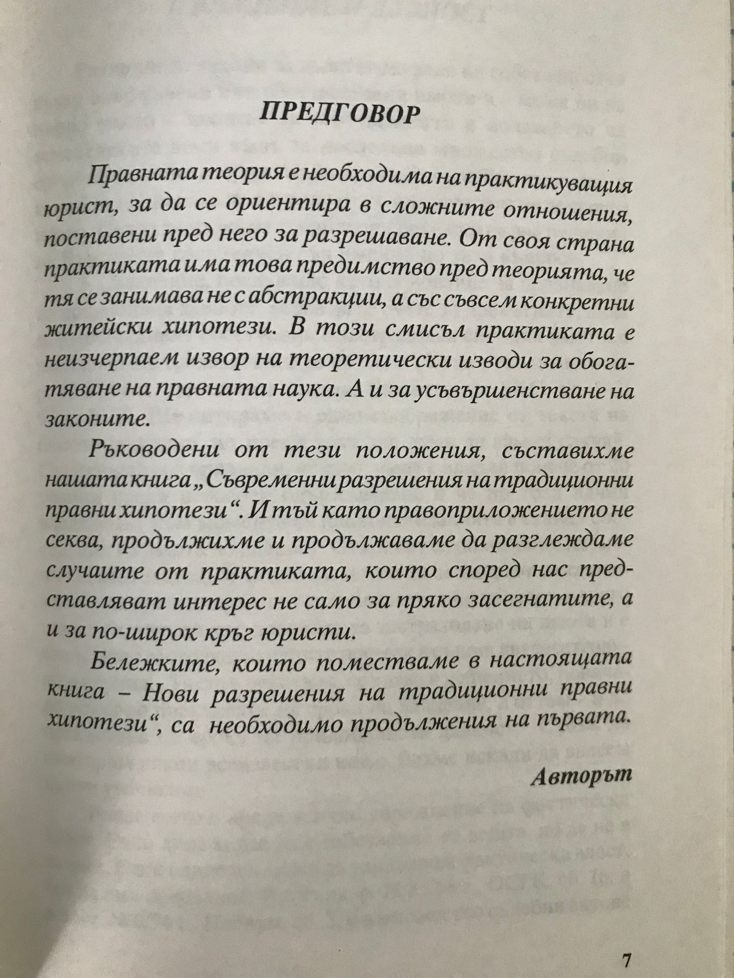 Правната теория е необходима на практикуващия юрист, за да се ориентира в сложните отношения, поставени пред него за разрешаване. От своя страна практиката има това предимство пред теорията, че тя се занимава не с абстракции, а със съвсем конкретни житейски хипотези. В този смисъл практиката е неизчерпаем извор на теоретически изводи за обогатяване на правната наука. А и за усъвършенстване на законите. Ръководени от тези положения, съставихме нашата книга „ Съвременни разрешения на традиционни правни хипотези ". И тъй като правоприложението не секва, продължихме и продължаваме да разглеждаме случаите от практиката, които според нас представляват интерес не само за пряко засегнатите, а и за no-широк кръг юристи. Книгата е продължение на "Съвременни разрешения на традиционни правни хипотези".