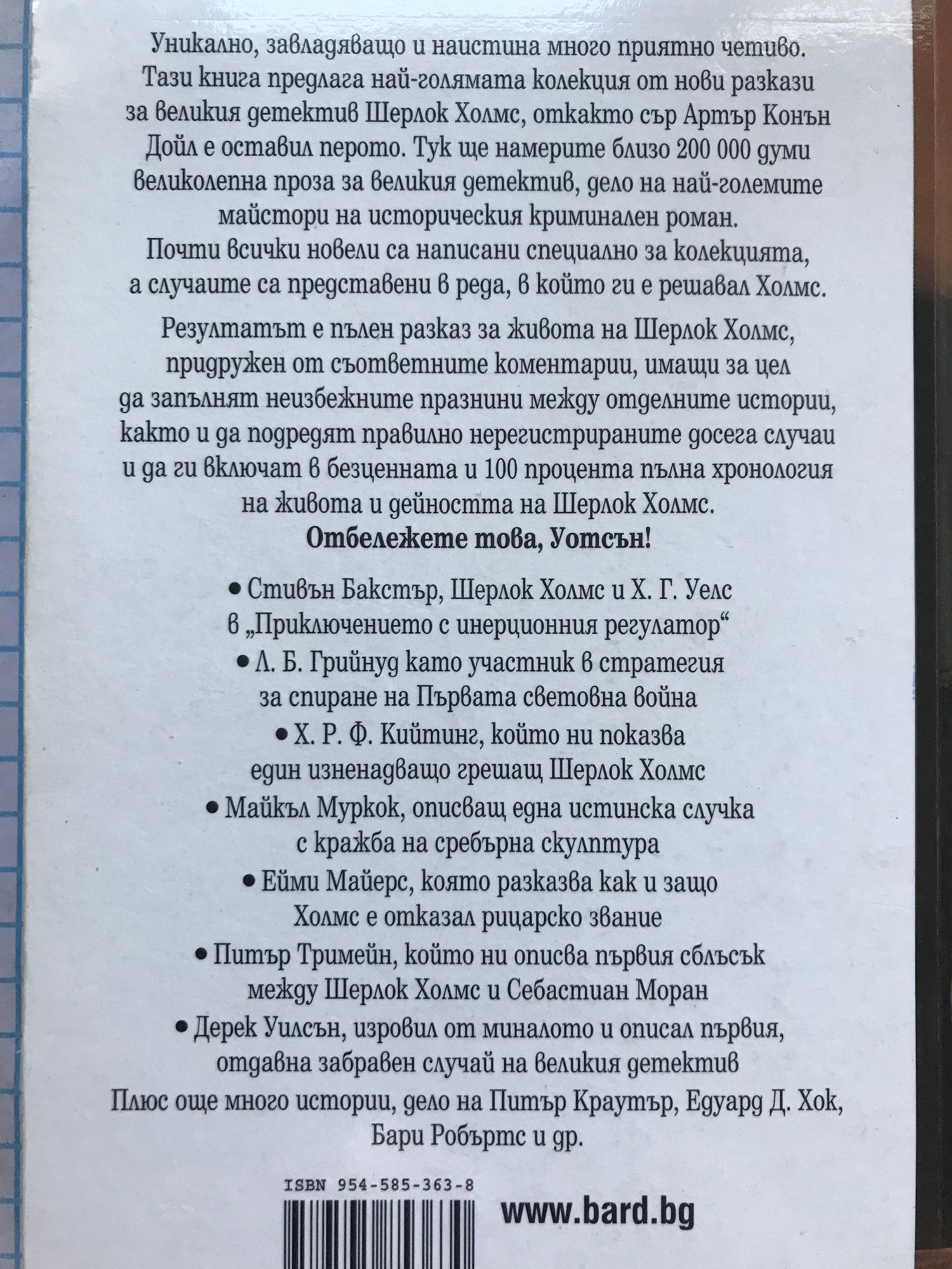 Животът и неизвестните случаи на най-великия детектив в света, описани от Майкъл Муркок, Стивън Бакстър, Х. Р. Ф. Кийтинг, Едуард Д. Хок, Ейми Майерс и много други. Уникално, завладяващо и наистина много приятно четиво. Тази книга предлага най-голямата колекция от нови разкази за великия детектив Шерлок Холмс, откакто сър Артър Конън Дойл е оставил перото. Тук ще намерите близо 200 000 думи великолепна проза за великия детектив, дело на най-големите майстори на историческия криминален роман. Почти всички новели са написани специално за колекцията, а случаите са представени в реда, в който ги е решавал Холмс. Резултатът е пълен разказ за живота на Шерлок Холмс, придружен от съответните коментарии, имащи за цел да запълнят неизбежните празнини между отделните истории, както и да подредят правилно нерегистрираните досега случаи и да ги включат в безценната и 100 процента пълна хронология на живота и дейността на Шерлок Холмс. Отбележете това, Уотсън! * Стивън Бакстър, Шерлок Холмс и Х. Г. Уелс в “Приключението с инерционния регулатор” * Л. Б. Грийнуд като участник в стратегия за спиране на Първата световна война * Х. Р. Ф. Кийтинг, който ни показва един изненадващо грешащ Шерлок Холмс * Майкъл Муркок, описващ една истинска случка с кражба на сребърна скулптура * Ейми Майерс, която разказва как и защо Холмс е отказал рицарско звание * Питър Тримейн, който ни описва първия сблъсък между Шерлок Холмс и Себастиан Моран * Дерек Уилсън, изровил от миналото и описал първия, отдавна забравен случай на великия детектив Плюс още много истории, дело на Питър Краутър, Едуард Д. Хок, Бари Робъртс и др.