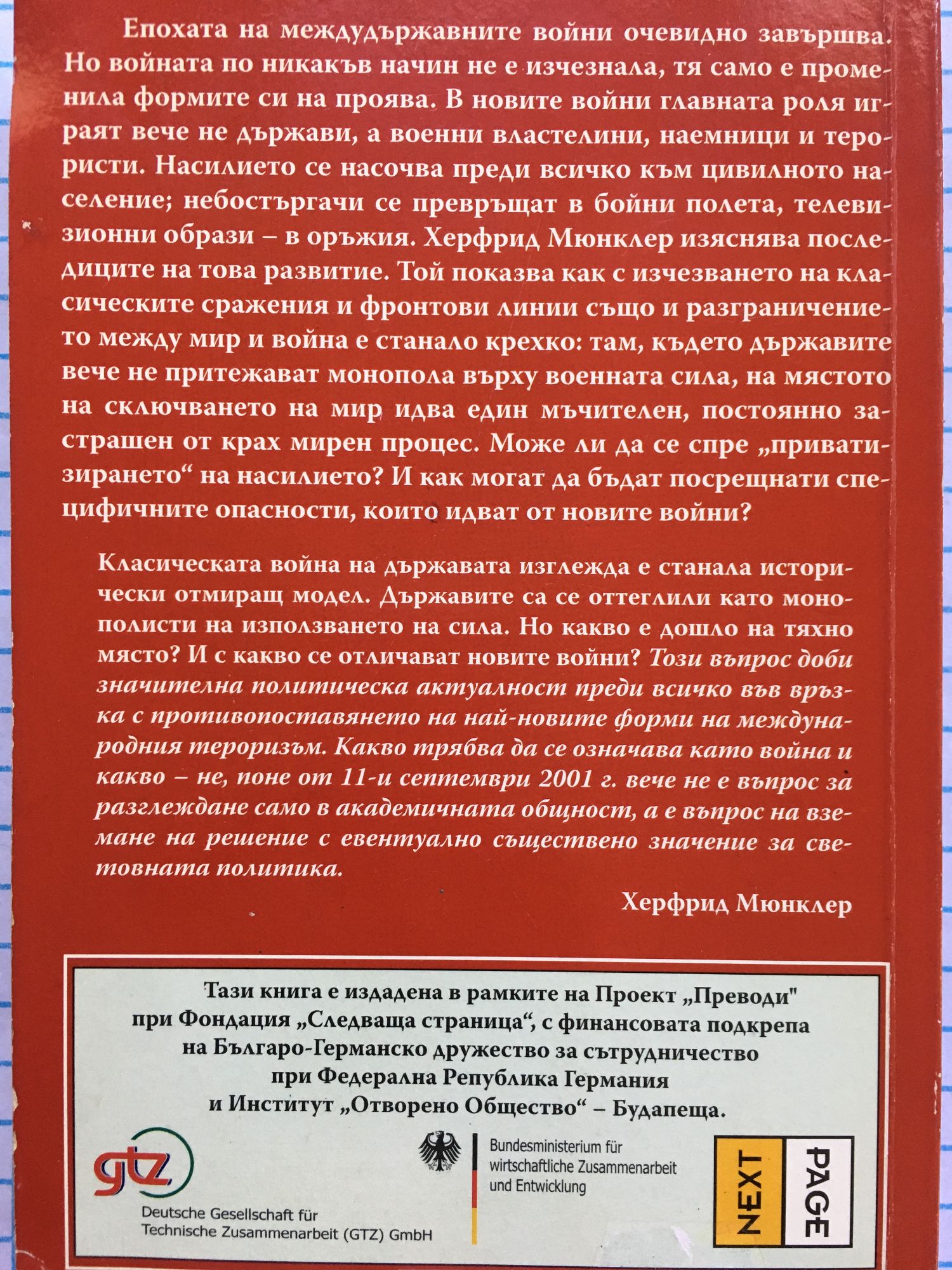 Епохата на междудържавните войни очевидно завършва. Но войната по никакъв начин не е изчезнала, тя само е променила формите си на проява. В новите войни главната роля играят вече не държави, а военни властелини, наемници и терористи. Насилието се насочва преди всичко към цивилното население; небостъргачи се превръщат в бойни полета, телевизионни образи – в оръжия. Херфрид Мюнклер изяснява последиците на това развитие. Той показва как с изчезването на класическите сражения и фронтови линии също и разграничението между мир и война е станало крехко: там, където държавите вече не притежават монопола върху военната сила, на мястото на сключването на мир идва един мъчителен, постоянно застрашен от крах мирен процес. Може ли да се спре „приватизирането“ на насилието? И как могат да бъдат посрещнати специфичните опасности, които идват от новите войни? Класическата война на държавата изглежда е станала исторически отмиращ модел. Държавите са се оттеглили като монополисти на използването на сила. Но какво е дошло на тяхно място? И с какво се отличават новите войни? „Този въпрос доби значителна политическа актуалност преди всичко във връзка с противопоставянето на най-новите форми на международния тероризъм. Какво трябва да се означава като война и какво – не, поне от 11-и септември 2001 г. вече не е въпрос за разглеждане само в академичната общност, а е въпрос на вземане на решение с евентуално съществено значение за световната политика.“