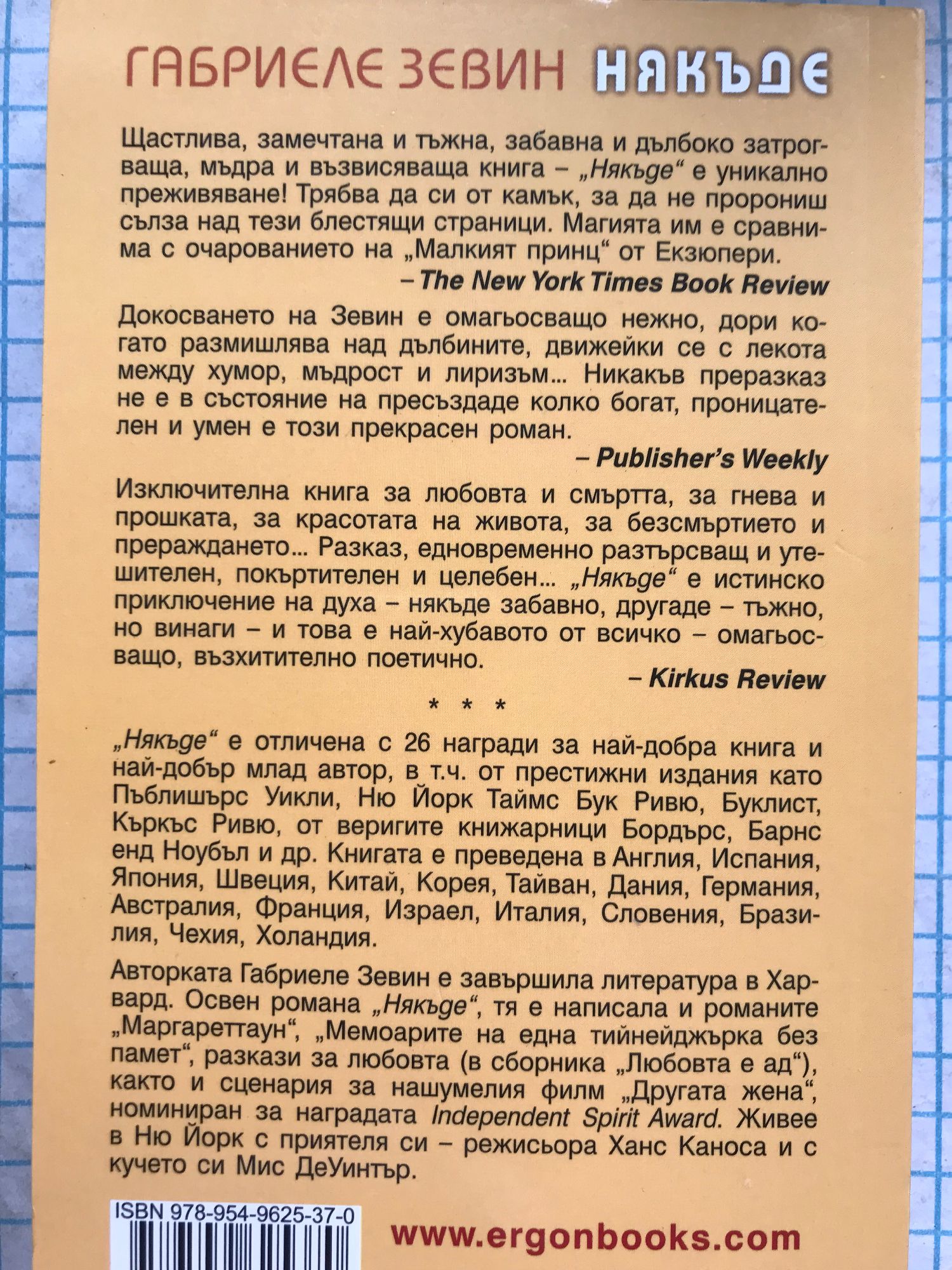 „Щастлива, замечтана и тъжна, забавна и дълбоко затрогваща, мъдра и възвисяваща книга – „Някъде е уникално преживяване! Трябва да си от камък, за да не пророниш сълза над тези блестящи страници. Магията им е сравнима с очарованието на „Малкият принц” от Екзюпери.” The New York Times Book Review "Докосването на Зевин е омагьосващо нежно, дори когато размишлява над дълбините, движейки се с лекота между хумор, мъдрост и лиризъм... Никакъв преразказ не е в състояние да пресъздаде колко богат, проницателен и умен е този прекрасен роман." Publisher`s Weekly