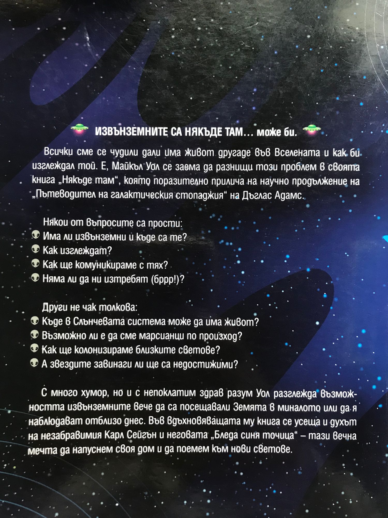 Всички сме се чудили дали има живот другаде във Вселената и как би изглеждал той. Е, д-р Майкъл Уол се заема да разнищи този проблем в своята книга „Някъде там”, която поразително прилича на научно продължение на „Пътеводител на галактическия стопаджия” на Дъглас Адамс. Някои от въпросите са прости: - Има ли извънземни и къде са те? - Как изглеждат? - Как ще комуникираме с тях? - Няма ли да ни изтребят (бррр!)? Други не чак толкова: - Къде в Слънчевата система може да има живот? - Възможно ли е да сме марсианци по произход? - Как ще колонизираме близките светове? - А звездите завинаги ли ще са недостижими? С много хумор, но ис непоклатим здрав разум д-р Уол разглежда възможността извънземните вече да са посещавали Земята в миналото или да я наблюдават отблизо днес. Във вдъхновяващата му книга се усеща и духът на незабравимия Карл Сейгън и неговата „Бледа синя точица” – тази вечна мечта да напуснем своя дом и да поемем към нови светове.