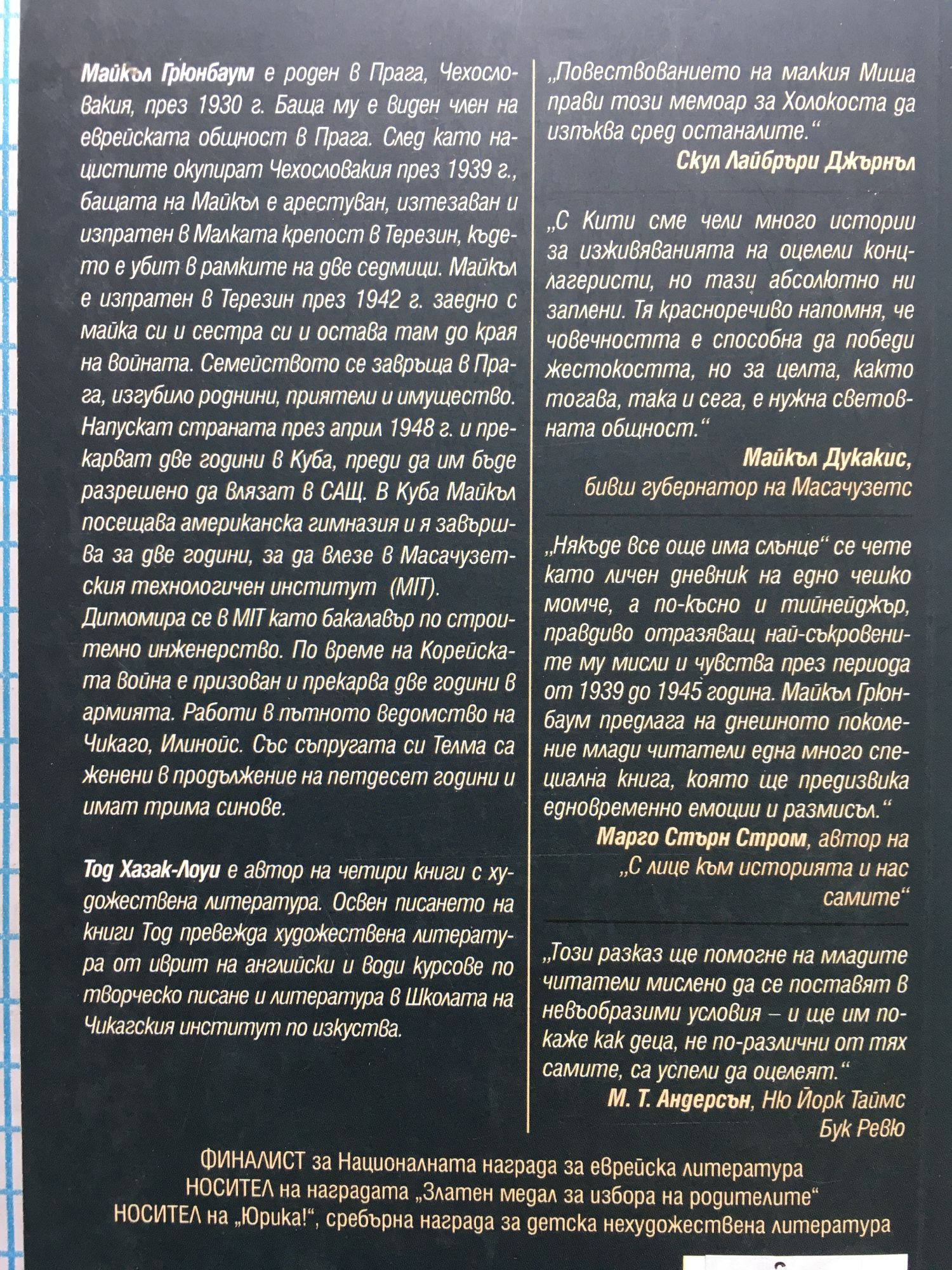 „Повествованието на малкия Миша прави този мемоар за Холокоста да изпъква сред останалите.” Скул Лайбръри Джърнал „С Кити сме чели много истории за изживяванията на оцелели концлагеристи, но тази абсолютно ни заплени. Тя красноречиво напомня, че човечността е способна да победи жестокостта, но за целта както тогава, така и сега, е нужна световната общност“. Майкъл Дукакис, бивш губернатор на Масачузетс „Някъде все още има слънце“ се чете като личен дневник на едно чешко момче, а по-късно и тийнейджър, правдиво отразяващ най-съкровените му мисли и чувства през периода от 1939 до 1945 г. Майкъл Грюнбаум предлага на днешното поколение млади читатели една много специална книга, която ще предизвика едновременно емоции и размисъл. Марго Стърн Стром, автор на „С лице към историята и нас самите“ „Този разказ ще помогне на младите читатели мислено да се поставят в невъобразими условия – и ще им покаже как деца, не по-различни от тях самите, са успели да оцелеят.“ М. Т. Андерсън, Ню Йорк Таймс Бук Ревю ФИНАЛИСТ ЗА Национална награда за еврейска литература НОСИТЕЛ НА наградата Златен медал за избора на родителите НОСИТЕЛ НА Юрика, сребърна награда за детска нехудожествена литература