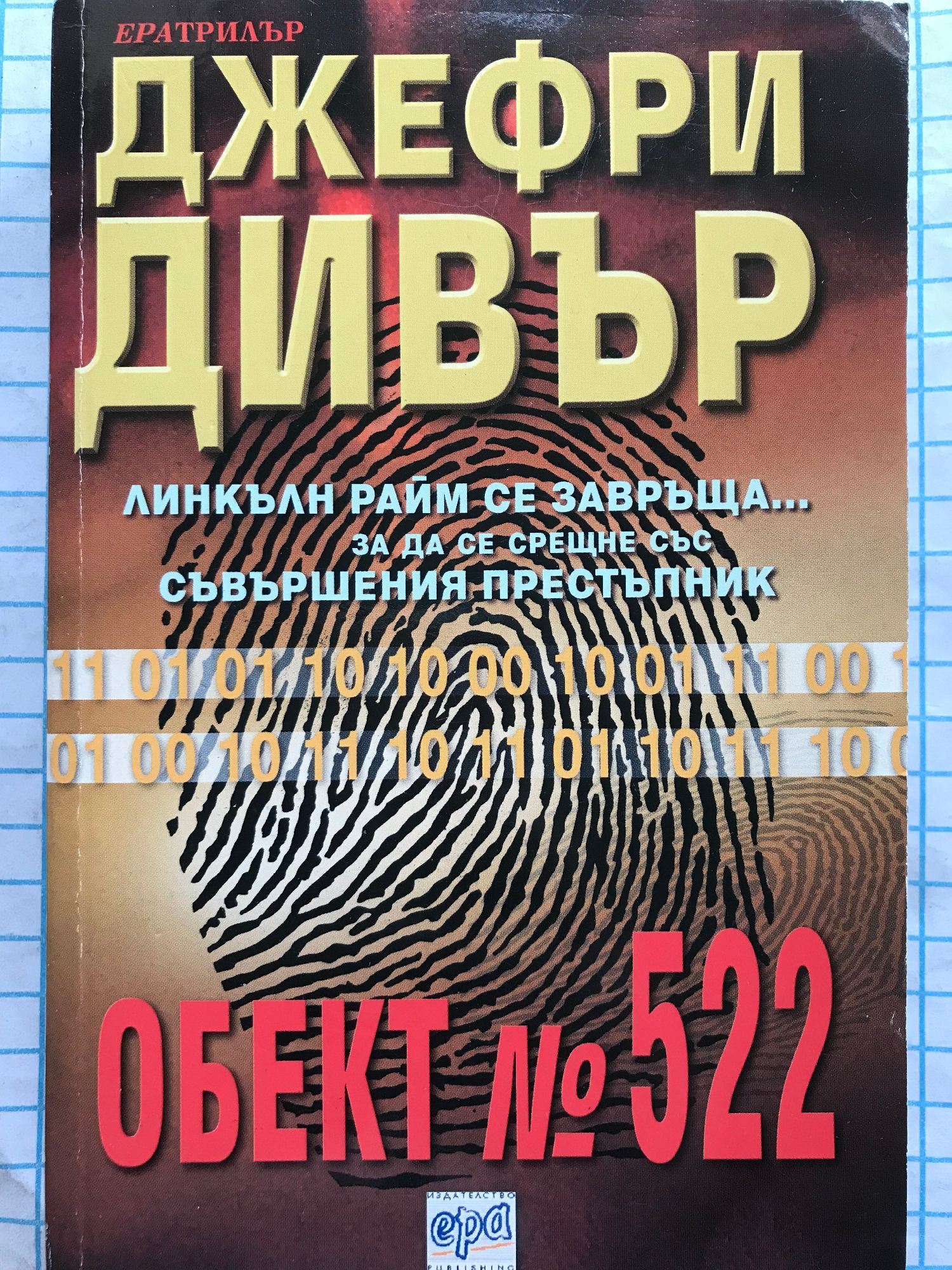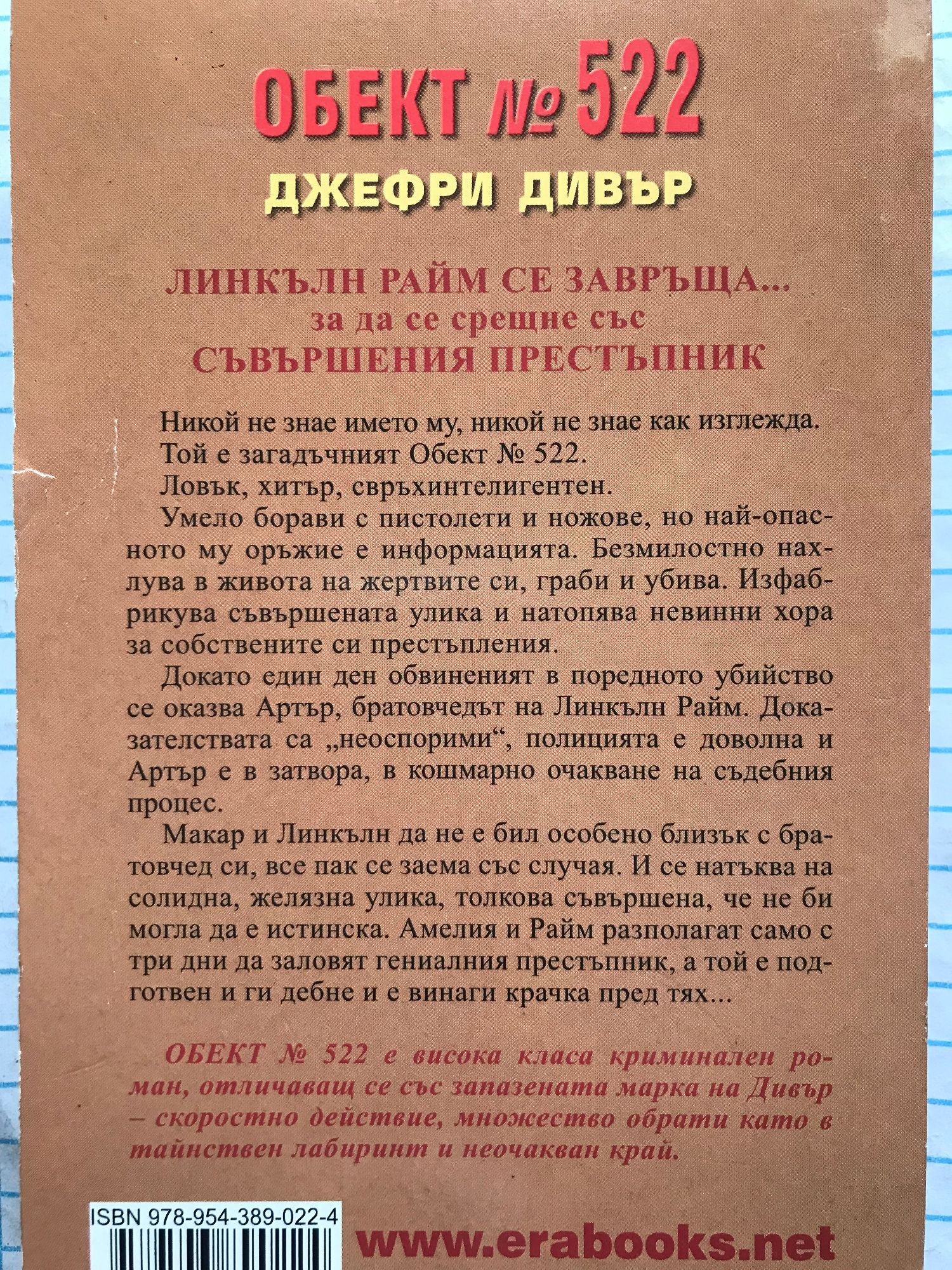 ЛИНКЪЛН РАЙМ СЕ ЗАВРЪЩА, ЗА ДА СЕ СРЕЩНЕ СЪС СЪВЪРШЕНИЯ ПРЕСТЪПНИК Никой не знае името му, никой не знае как изглежда. Той е загадъчният Обект № 522. Ловък, хитър, свръхинтелигентен. Умело борави с пистолети и ножове, но най-опасното му оръжие е информацията. Безмилостно нахлува в живота на жертвите си, граби и убива. Изфабрикува съвършената улика и натопява невинни хора за собствените си престъпления. Докато един ден обвиненият в поредното убийство се оказва Артър, братовчедът на Линкълн Райм. Доказателствата са „неоспорими”, полицията е доволна и Артър е в затвора, в кошмарно очакване на съдебния процес. Макар и Линкълн да не е бил особено близък с братовчед си, все пак се заема със случая. И се натъква на солидна, желязна улика, толкова съвършена, че не би могла да е истинска. Амелия и Райм разполагат само с три дни да заловят гениалния престъпник, а той е подготвен и ги дебне и е винаги крачка пред тях... ОБЕКТ № 522 е висока класа криминален роман, отличаващ се със запазената марка на Дивър – скоростно действие, множество обрати като в тайнствен лабиринт и неочакван край.