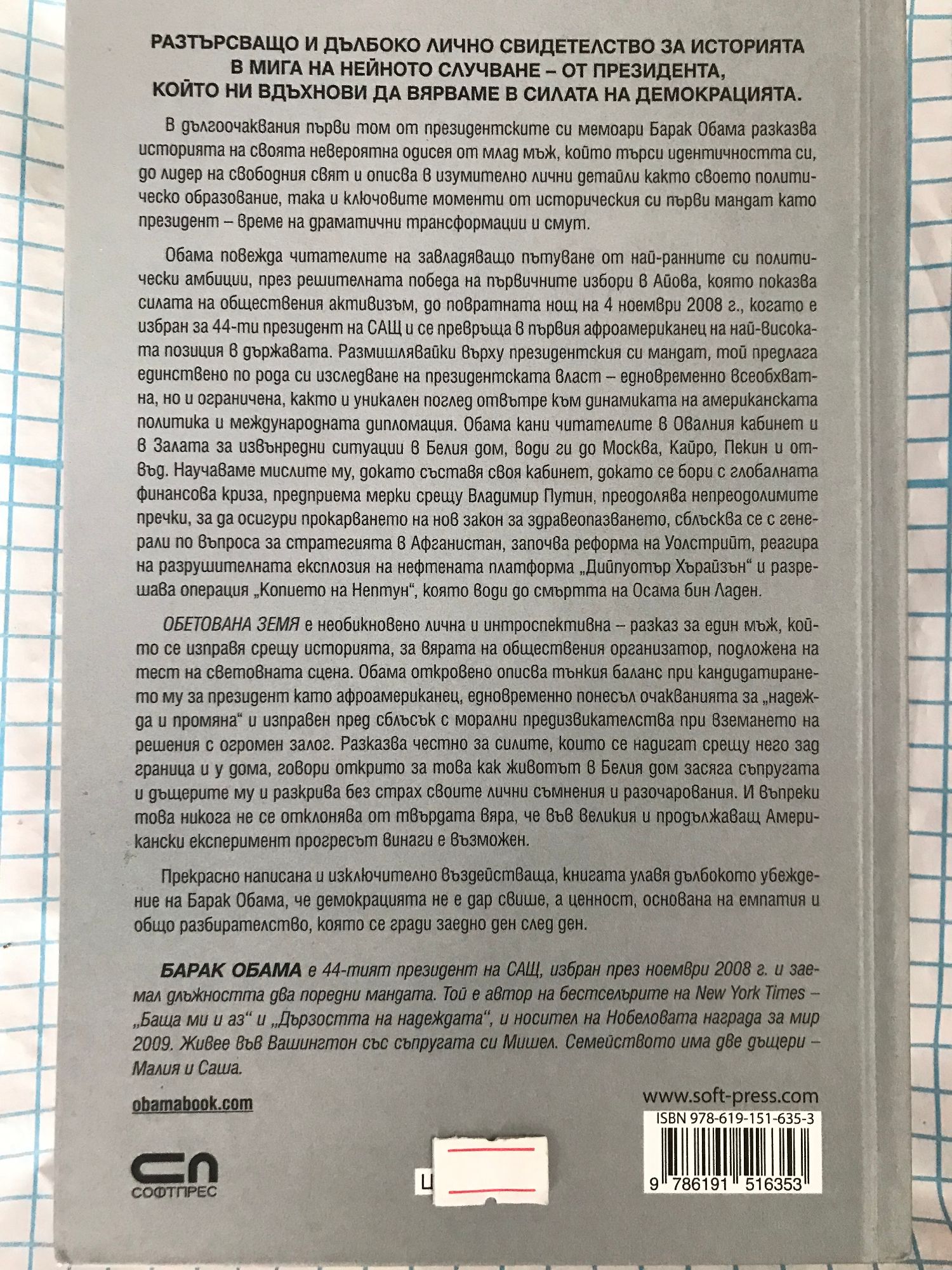 В "Обетована земя" Барак Обама разказва от първо лице историята на своята невероятна одисея от млад мъж, който търси своята идентичност, до лидер на свободния свят и описва в изумително лични детайли както своето политическо образование, така и ключовите моменти от историческия си първи мандат като президент - време на драматични трансформации и смут. Предоставяйки разтърсващо, дълбоко лично свидетелство за историята в мига на нейното случване, Обама повежда читателите на завладяващо пътуване от най-ранните си политически амбиции, през решителната победа на първичните избори в Айова, която показва силата на обществения активизъм, до повратната нощ на 4 ноември 2008 г., когато е избран за 44-ти президент на САЩ и се превръща в първия афроамериканец на най-високата позиция в държавата. Размишлявайки върху президентския си мандат, той предлага дълбоко и единствено по рода си изследване и на невероятния обхват, и на ограниченията на президентската власт, както и уникален поглед отвътре към динамиката на американската партийна политика и международната дипломация. Обама кани читателите в Овалния кабинет и в Залата за извънредни ситуации в Белия дом, води ги до Москва, Кайро, Пекин и отвъд. Научаваме мислите му, докато съставя своя кабинет, докато се бори с глобалната финансова криза, предприема мерки срещу Владимир Путин, преодолява непреодолимите пречки, за да осигури прокарването на нов закон за здравеопазването, сблъсква се с генерали по въпроса за американската стратегия в Афганистан, започва реформа на Уолстрийт, отговаря на разрушителната експлозия на нефтената платформа "Дийпуотър Хърайзън" и разрешава операция "Копието на Нептун", която води до смъртта на Осама бин Ладен. "Обетована земя" е необикновено лична и интроспективна - историята на един мъж, който се изправя срещу историята, разказ за вярата на обществения организатор, подложена на тест на световната сцена. Обама откровено описва тънкия баланс при кандидатирането му за президент като афроамериканец, едновременно понесъл очакванията на едно поколение, вкопчено в посланията за "надежда и промяна", и изправен пред сблъсък с морални предизвикателства при вземането на решения с огромен залог. Разказва честно за силите, които се изправят срещу него зад граница и у дома, говори открито за това как животът в Белия дом засяга неговата съпруга и дъщерите му и разкрива без страх своите лични съмнения и разочарования. И въпреки това никога не се отклонява от твърдата вяра, че във великия и продължаващ Американски експеримент прогресът винаги е възможен.