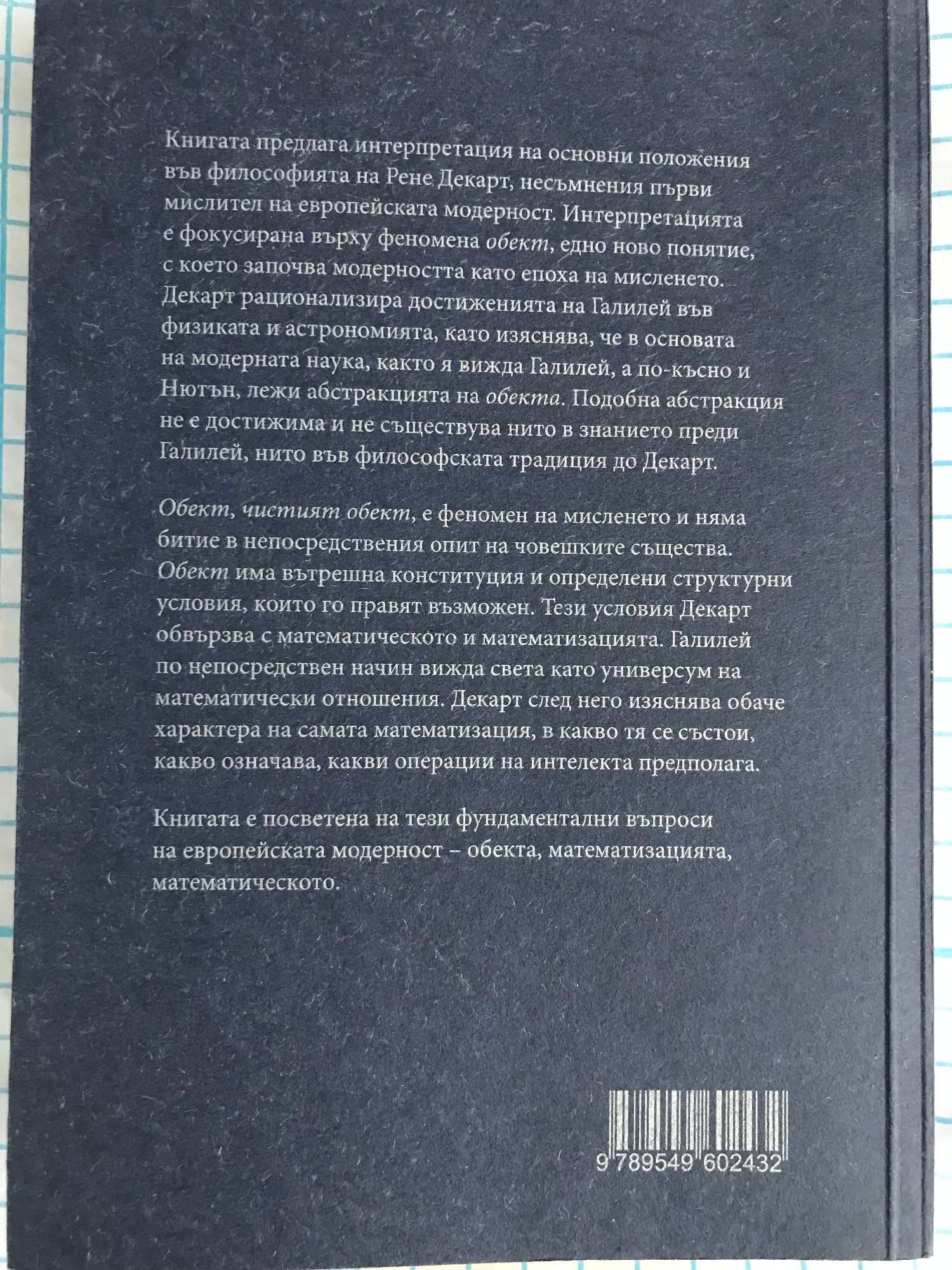 Книгата предлага интерпретация на основни положения във философията на Рене Декарт, несъмнения първи мислител на европейската модерност. Интерпретацията е фокусирана върху феномена обект, едно ново понятие, с което започва модерността като епоха на мисленето. Декарт рационализира достиженията на Галилей във физиката и астрономията, като изяснява, че в основата на модерната наука, какта я вижда Галилей, а по-късно и Нютон, лежи абстракцията на обекта. Подобна абстракция не е достижима и не съществува нито в знанието преди Галилей, нито във философската традиция до Декарт. Обект, чистият обект, е феномен на мисленето и няма битие в непосредствения опит на човешките същества. Обект има вътрешна конституция и определени структурни условия, които го правят възможен. Тези условия Декарт обвързва с математическото и математизацията. Галилей по непосредствен начин вижда света като универсум на математически отношения. Декарт след него изяснява обаче характера на самата математизация, в какво тя се състои, какво означава, какви операции на интелекта предполага. Книгата е посветена на тези фундаментални въпроси на европейската модерност - обекта, математизацията, математическото.