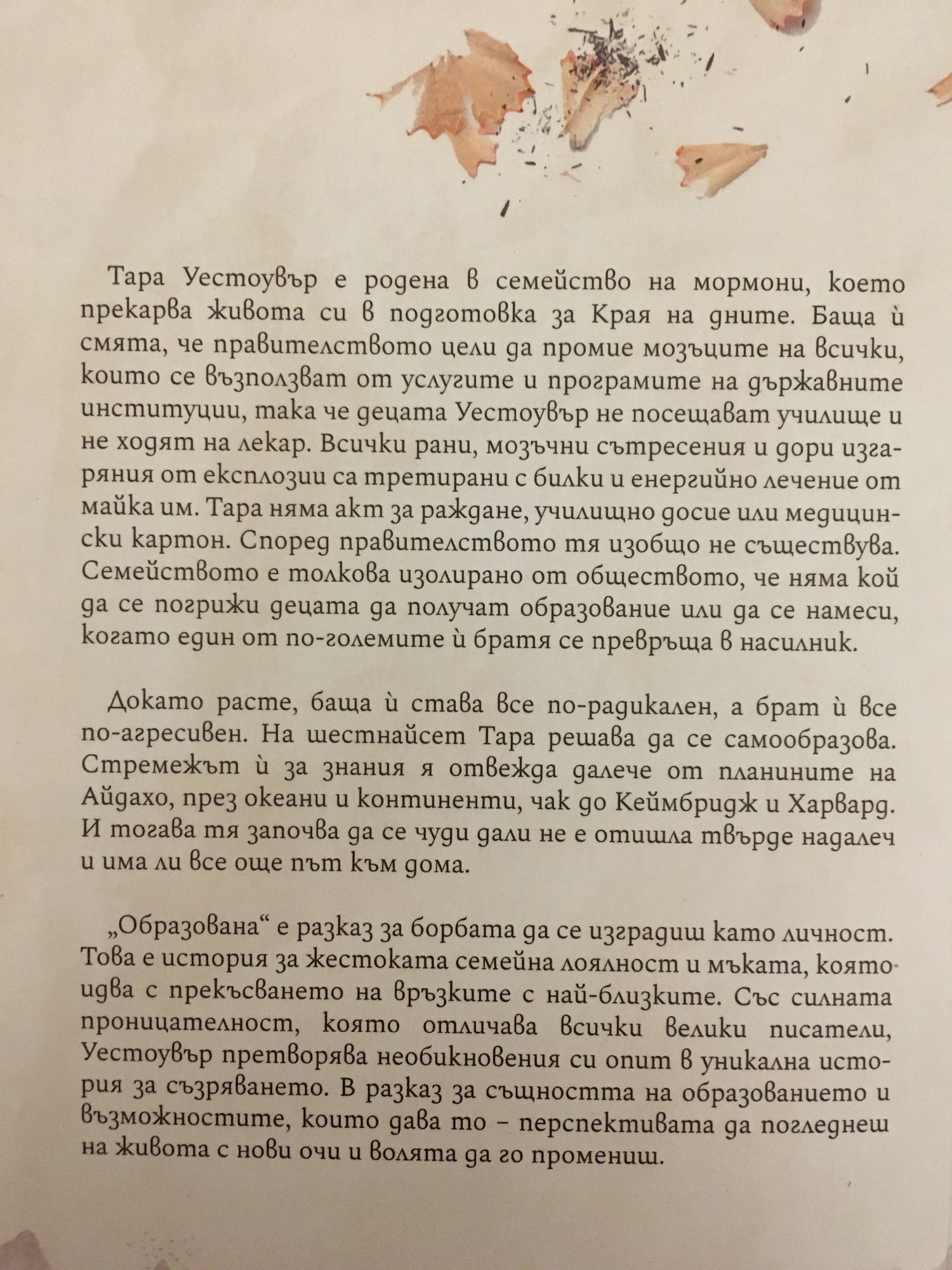 „Образована“ е разказ за борбата да се изградиш като личност. Това е история за жестоката семейна лоялност и мъката, която идва с прекъсването на връзките с най-близките. Със силната проницателност, която отличава всички велики писатели, Уестоувър претворява необикновения си опит в уникална история за съзряването. В разказ за същността на образованието и възможностите, които дава то – перспективата да погледнеш на живота с нови очи и волята да го промениш. Тара Уестоувър е родена в семейство на мормони, което прекарва живота си в подготовка за Края на дните. Баща й смята, че правителството цели да промие мозъците на всички, които се възползват от услугите и програмите на държавните институции, така че децата Уестоувър не посещават училище и не ходят на лекар. Всички рани, мозъчни сътресения и дори изгаряния от експлозии са третирани с билки и енергийно лечение от майка им. Тара няма акт за раждане, училищно досие или медицински картон. Според правителството тя изобщо не съществува. Семейството е толкова изолирано от обществото, че няма кой да се погрижи децата да получат образование или да се намеси, когато един от по-големите й братя се превръща в насилник. Докато расте, баща й става все по-радикален, а брат й все по-агресивен. На шестнайсет Тара решава да се самообразова. Стремежът й за знания я отвежда далече от планините на Айдахо, през океани и континенти, чак до Кеймбридж и Харвард. И тогава тя започва да се чуди дали не е отишла твърде надалеч и има ли все още път към дома.