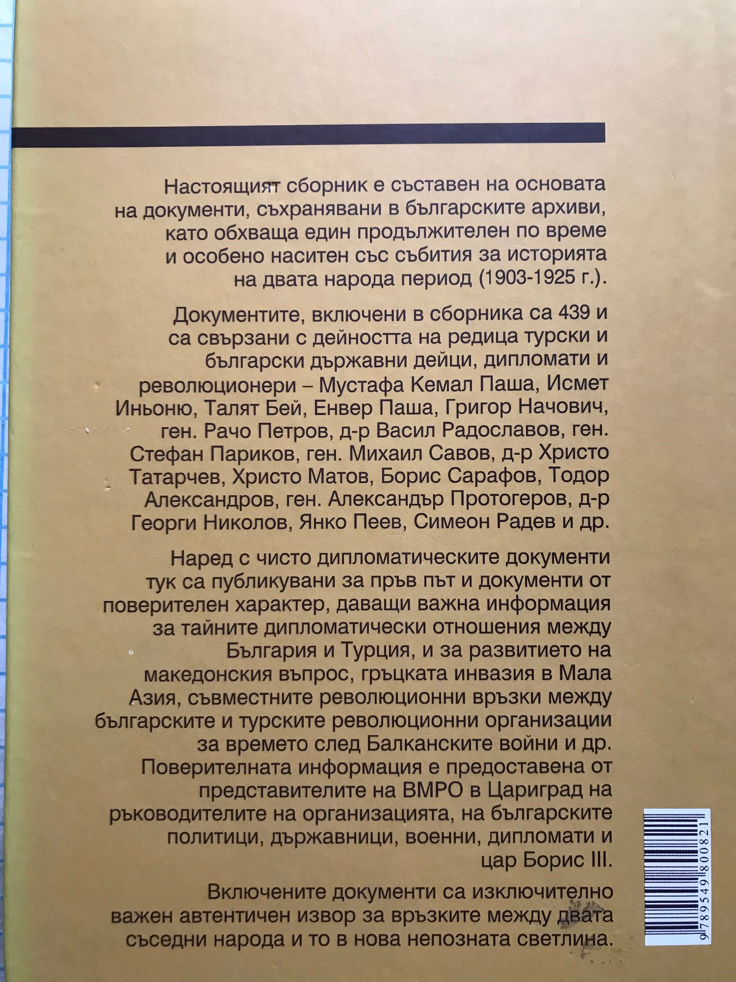 Настоящият сборник е съставен на основата на документи, съхранявани в българските архиви, като обхваща един продължителен по време и особено наситен със събития за историята на двата народа период (1903-1925 г.). Документите, включени в сборника са 439 и са свързани с дейността на редица турски и български държавни дейци, дипломати и революционери - Мустафа Кемал Паша, Исмет Иньоню, Талят Бей, Енвер Паша, Григор Начович, ген. Рачо Петров, д-р Васил Радославов, ген. Стефан Париков, ген. Михаил Савов, д-р Христо Татарчев, Христо Матов, Борис Сарафов, Тодор Александров, ген. Александър Протогеров, д-р Георги Николов, Янко Пеев, Симеон Радев и др. Наред с чисто дипломатическите документи тук са публикувани за пръв път и документи от поверителен характер, даващи важна информация за тайните дипломатически отношения между България и Турция, и за развитието на македонския въпрос, гръцката инвазия в Мала Азия, съвместните революционни връзки между българските и турските революционни организации за времето след Балканските войни и др. Поверителната информация е предоставена от представителите на ВМРО в Цариград на ръководителите на организацията, на българските политици, държавници, военни, дипломати и цар Борис III. Включените документи са изключително важен автентичен извор за връзките между двата съседни народа и то в нова непозната светлина.
