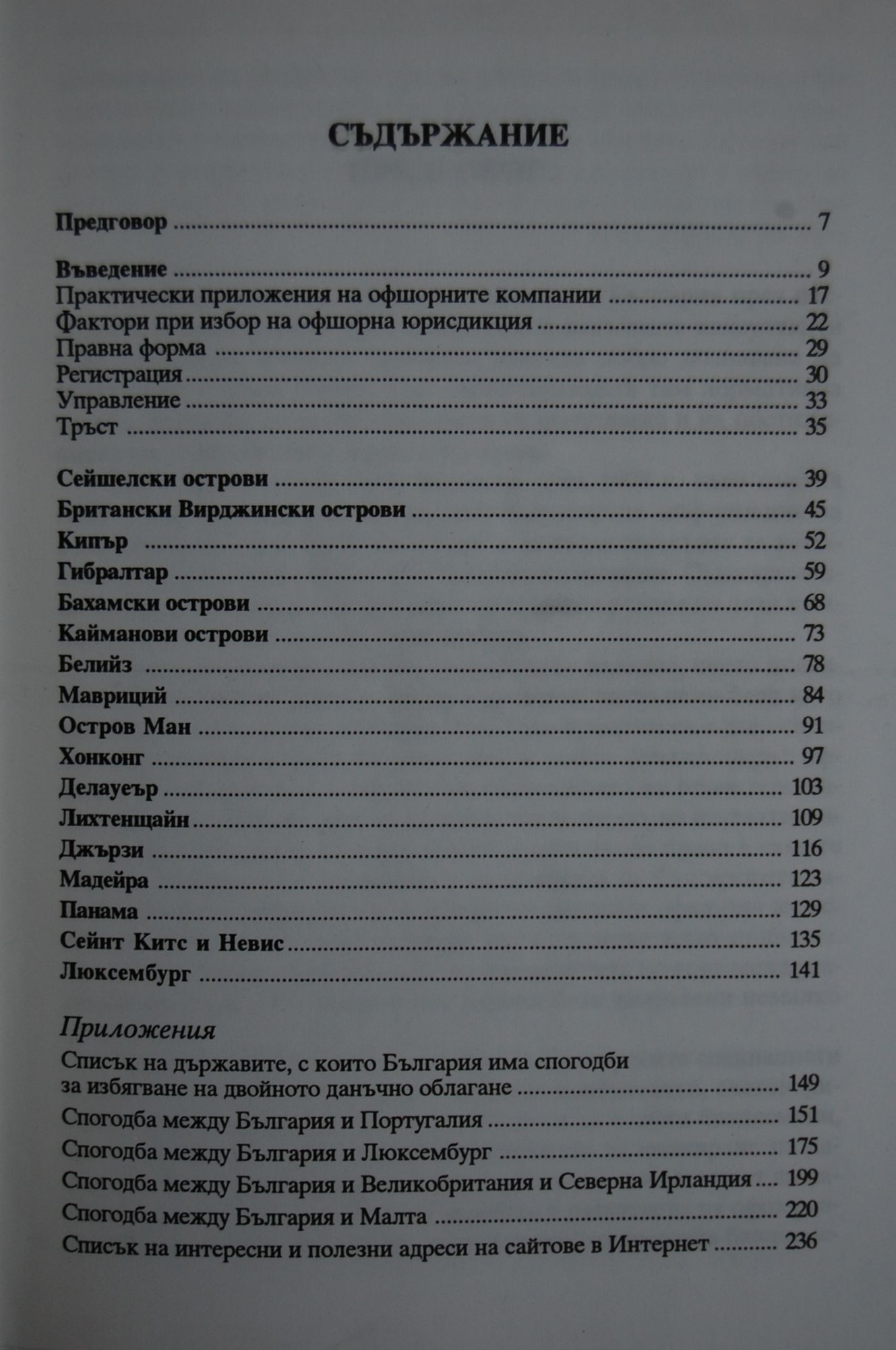 Развитието на търговските отношения в България през последните години поставя пред адвокатите и данъчните консултанти Нови проблеми. Тяхното решаване изисква добро познаване на практиката в други страни и на съществуващата там нормативна уредба, ползване на международните споразумения и на постиженията на съвременната правна доктрина. Настоящата книга беше издадена през 1998 г. като първия опит у нас за предоставяне на систематизирана информация за същността на офшорните компании и за възможностите за намаляване на данъчното бреме чрез тяхното използване. Същевременно тя предлага подробно описание на правния режим на тези компании в 17 чуждестранни юрисдикции. Това е второ допълнено и преработено издание, чието появяване беше продиктувано от редица промени, настъпили след като книгата беше издадена за първи път. Тези промени са в две основни направления: първо, на условията, в които функционират офшорните юрисдикции и най-вече на отношението на правит та и международните институции към тях и, второ, на нормативната уредба в областта на търговското и данъчното право в самите страни. Разбира се, в сравнение с динамиката на българското законодателство, нормативната уредба в отделните офшорни юрисдикции може да се характеризира като изключително стабилна. Все пак, най-вече под влиянието на споменатите по-горе международни фактори в последните две години бяха направени немалко изменения. Книгата е предназначена не само за българските специалисти в областта на данъчното право (данъчни консултанти, счетоводители, юрисконсулти, адвокати и т.н.), но и за всички бизнесмени, които проявяват интерес към възможността за планиране на данъците си чрез механизма на офшорните компании и могат да намерят тук Полезни идеи.