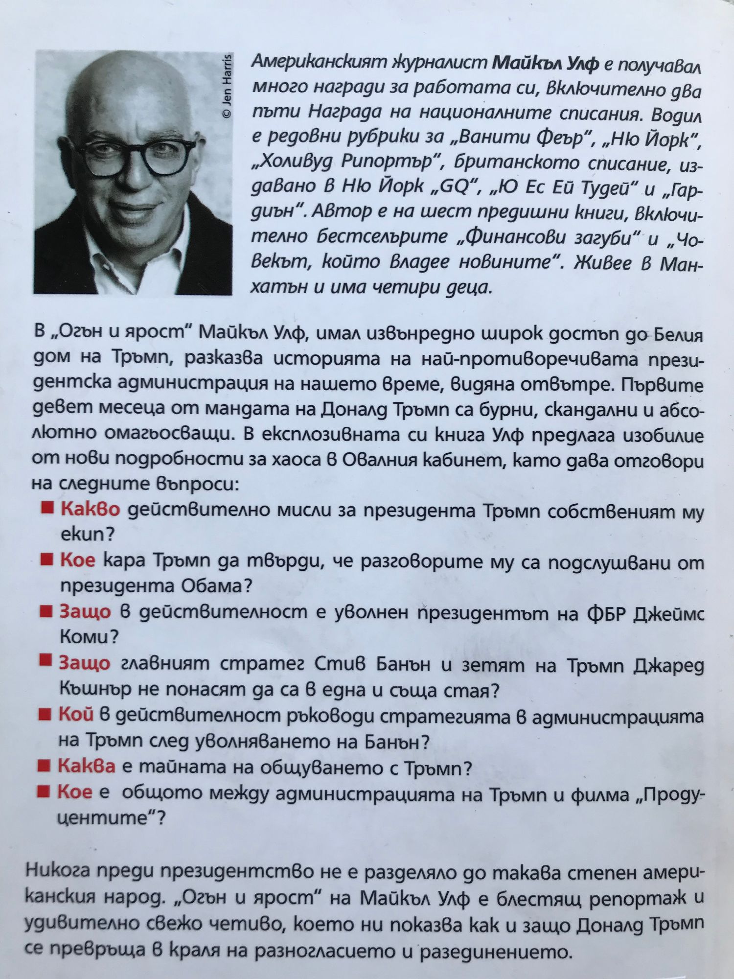 Майкъл Улф, имал извънредно широк достъп до Белия дом на Тръмп, разказва историята на най-противоречивата президентска администрация на нашето време, видяна отвътре. Първите девет месеца от мандата на Доналд Тръмп са бурни, скандални и абсолютно омагьосващи. В експлозивната си книга Улф предлага изобилие от нови подробности за хаоса в Овалния кабинет. Ето част от отговорите, които дава: - Какво действително мисли за президента Тръмп собственият му екип - Кое кара Тръмп да твърди, че разговорите му са подслушвани от президента Обама - Защо в действителност е уволнен президентът на ФБР Джеймс Коми - Защо главният стратег Стив Банън и зетят на Тръмп Джаред Къшнър не понасят да са в една и съща стая - Кой в действителност ръководи стратегията в администрацията на Тръмп след уволняването на Банън - Каква е тайната на общуването с Тръмп - Кое е общото между администрацията на Тръмп и филма „Продуцентите“