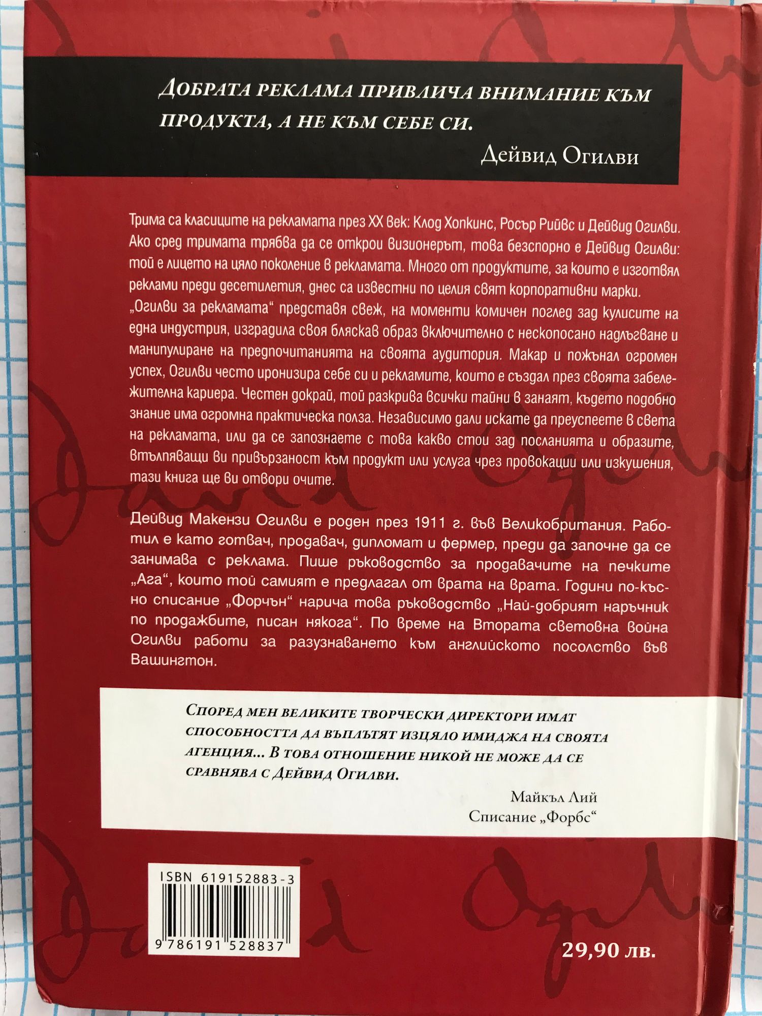 Добрата реклама привлича внимание към продукта, а не към себе си. Дейвид Огилви Трима са класиците на рекламата през ХХ век: Клод Хопкинс, Росър Рийвс и Дейвид Огилви. Ако сред тримата трябва да се открои визионерът, това безспорно е Дейвид Огилви: той е лицето на цяло поколение в рекламата. Много от продуктите, за които е изготвял реклами преди десетилетия, днес са известни по целия свят корпоративни марки. „Огилви за рекламата“ представя свеж, на моменти комичен поглед зад кулисите на една индустрия, изградила своя бляскав образ включително с нескопосано надлъгване и манипулиране на предпочитанията на своята аудитория. Макар и пожънал огромен успех, Огилви често иронизира себе си и рекламите, които е създал през своята забележителна кариера. Честен докрай, той разкрива всички тайни в занаят, където подобно знание има огромна практическа полза. Независимо дали искате да преуспеете в света на рекламата, или да се запознаете с това какво стои зад посланията и образите, втълпяващи ви привързаност към продукт или услуга чрез провокации или изкушения, тази книга ще ви отвори очите. Дейвид Макензи Огилви е роден през 1911 г. във Великобритания. Работил е като готвач, продавач, дипломат и фермер, преди да започне да се занимава с реклама. Пише ръководство за продавачите на печките „Ага“, които той самият е предлагал от врата на врата. Години по-късно списание „Форчън“ нарича това ръководство „Най-добрият наръчник по продажбите, писан някога“. По време на Втората световна война Огилви работи за разузнаването към английското посолство във Вашингтон. Според мен великите творчески директори имат способността да въплътят изцяло имиджа на своята агенция... В това отношение никой не може да се сравнява с Дейвид Огилви.