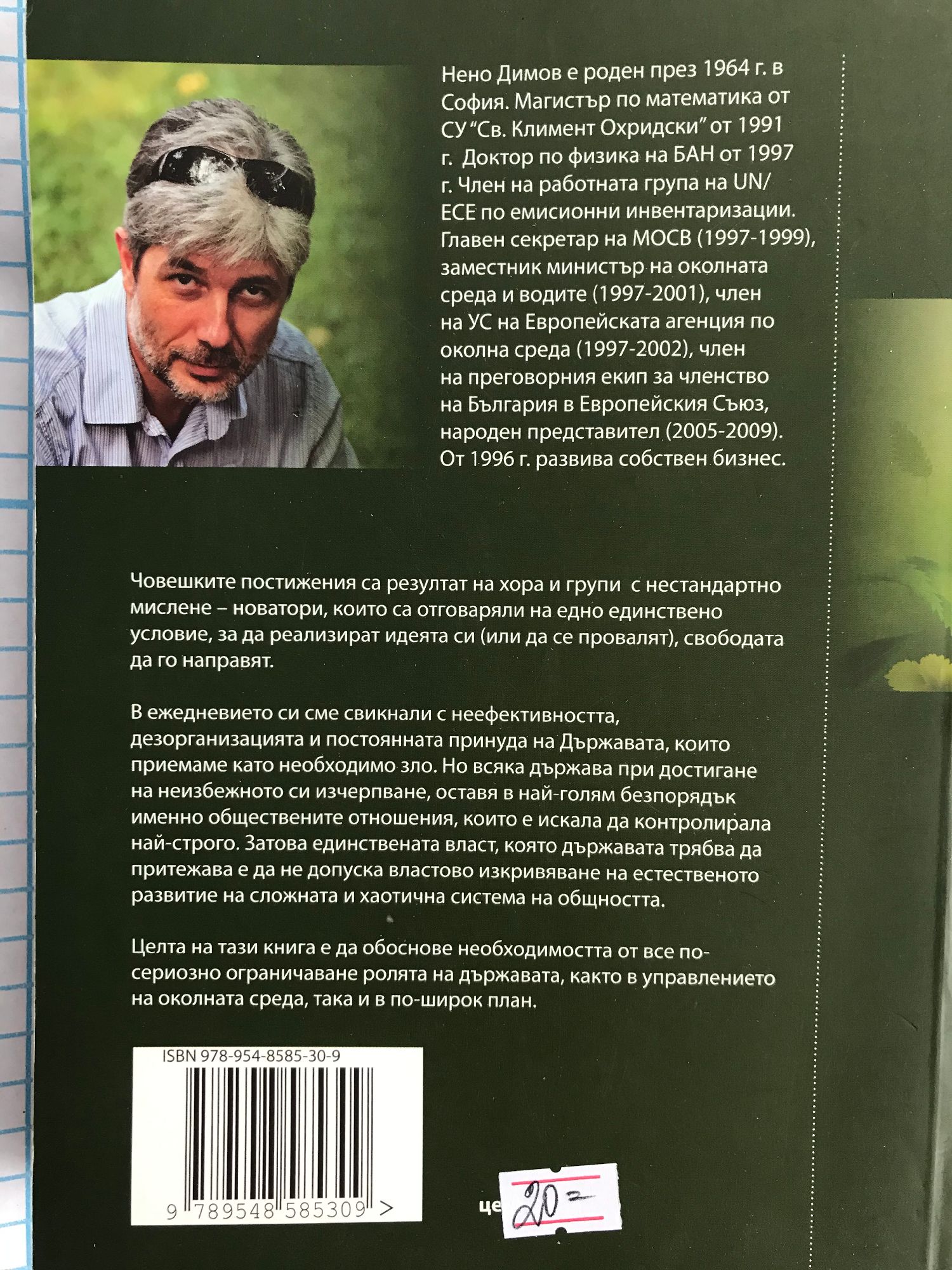 Нено Димов е роден през 1964 г. в София. Магистър по математика от СУ "Св.Климент Охридски" от 1991 г. Доктор по физика на БАН от 1997 г. От 1996 г. развива собствен бизнес. Човешките постижения са резултат на хора и групи с нестандартно мислене - новатори, които са отговаряли на едно единствено условие, за да реализират идеята си /или да се провалят/, свободата да го направят. В ежедневието си сме свикнали с неефективността, дезорганизацията и постоянната принуда на Държавата, които приемаме като необходимо зло. Но всяка държава при достигане на неизбежното си изчерпване, оставя в най-голям безпорядък именно обществените отношения, които е искала да контролира най-строго. Затова единствената власт, която държавата трябва да притежава е да не допуска властово изкривяване на естественото развитие на сложната и хаотична система на общността. Целта на тази книга е да обоснове необходимостта от все по-сериозно ограничаване ролята на държавата, както в управлението на околната среда, така и в по-широк план.