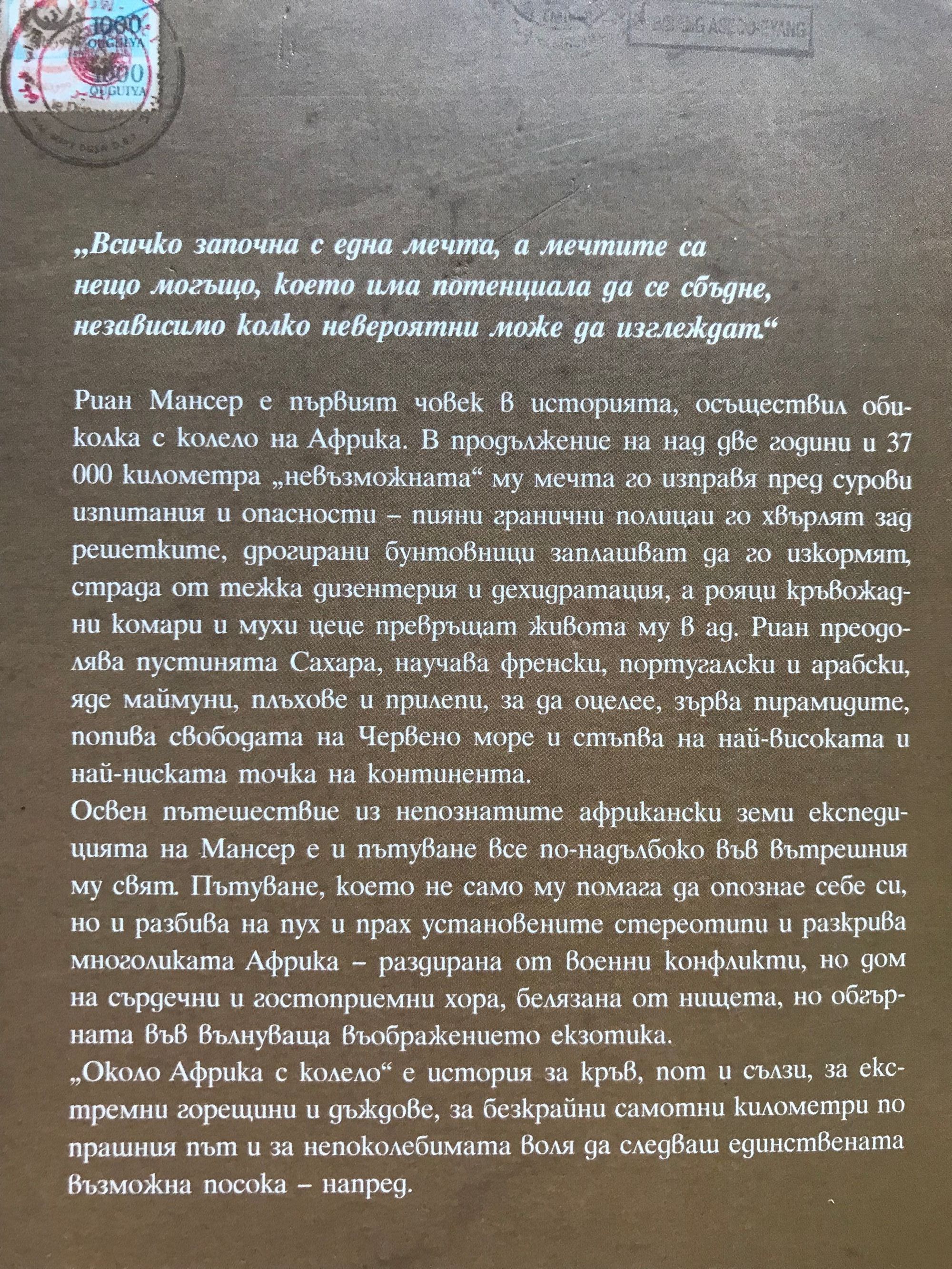 Риан Мансер е първият човек в историята, осъществил обиколка с колело на Африка. В продължение на над две години и 37 000 километра „невъзможната“ му мечта го изправя пред сурови изпитания и опасности – пияни гранични полицаи го хвърлят зад решетките, дрогирани бунтовници заплашват да го изкормят, страда от тежка дизентерия и дехидратация, а рояци кръвожадни комари и мухи цеце превръщат живота му в ад. Риан преодолява пустинята Сахара, научава френски, португалски и арабски, яде маймуни, плъхове и прилепи, за да оцелее, зърва пирамидите, попива свободата на Червено море и стъпва на най-високата и най-ниската точка на континента. Освен пътешествие из непознатите африкански земи експедицията на Мансер е и пътуване все по-надълбоко във вътрешния му свят. Пътуване, което не само му помага да опознае себе си, но и разбива на пух и прах установените стереотипи и разкрива многоликата Африка – раздирана от военни конфликти, но дом на сърдечни и гостоприемни хора, белязана от нищета, но обгърната във вълнуваща въображението екзотика. „Около Африка с колело“ е история за кръв, пот и сълзи, за екстремни горещини и дъждове, за безкрайни самотни километри по прашния път и за непоколебимата воля да следваш единствената възможна посока – напред. Южноафриканецът Риан Мансер (1973) е един от най-известните приключенци на нашето време. Пътешествието му около Африка получава признание от самия Нелсън Мандела, който пожелава лична среща със смелчагата дръзнал да обиколи едни от най-опасните и размирни места на планетата. След обиколката на Мадагаскар, описана в книгата „С каяк около Мадагаскар“, издателство „Вакон“ Мансер се отдава на заслужена почивка, а през 2011 г. се отправя към мистичната Исландия. През 2014 г. Мансер и съпругата му Васти стават първите и до момента единствени хора, гребали от континенталната част на Африка до континенталната част на Северна Америка.
