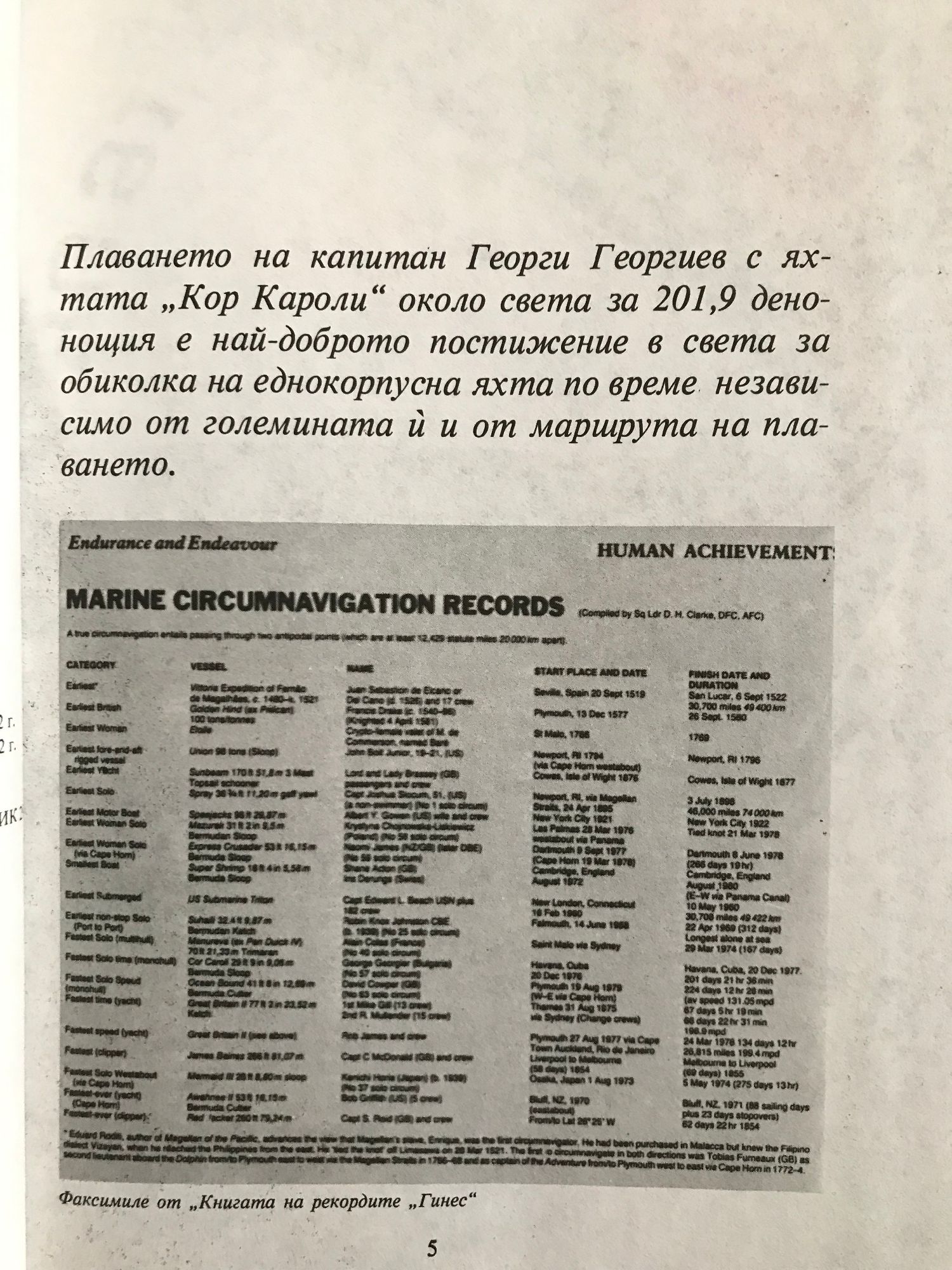 Капитан Георги Георгиев е първият българин, сам обиколил земята с яхта. На 20 декември 1976 година, след успеха му в Трансатлантическата регата "ОСТАР-76" - световното ветрходно съзтезание с най-голямо реноме, той отплава от Хавана с деветметровата яхта "Кор Кароли", преминава Панамския канал и стига Маркизките острови в Тихия океан. Оттам се насочва към остров Фиджи, доплава до него и е единственият, който през март - месеца на тропическите депресии в този район - влиза в Сува. После спира в стралийския порт Дарвин, пресича неспокойния през август и септември Индийски океан. Преди Кейптаун се преборва с вълните-убийци и през Южния Атлантик, на 20 декември 1977 година, се завръща отново в Хавана. Там той сключва кръга. Това околосветско плаване Георги Георгиев извършва за рекордно кратък срок. В „Книгата на рекордите на Гинес", издание 1981-1982 година, той е включен с постижението си - 201 дена, 21 часа и 36 минути.