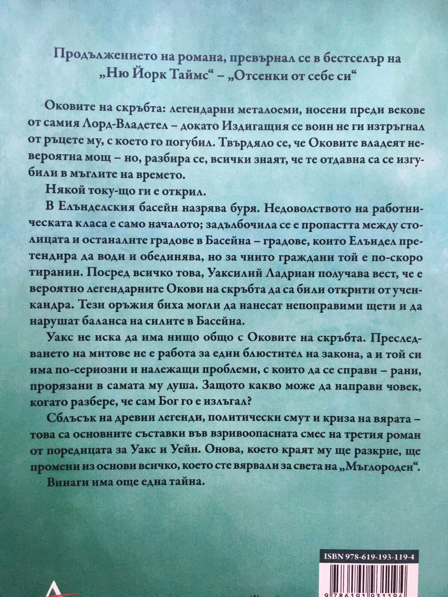 Продължението на романа, превърнал се в бестселър на „Ню Йорк Таймс“ – „Отсенки от себе си“ Оковите на скръбта: легендарни металоеми, носени преди векове от самия Лорд-Владетел – докато Издигащия се воин не ги изтръгнал от ръцете му, с което го погубил. Твърдяло се, че Оковите владеят невероятна мощ – но, разбира се, всички знаят, че те отдавна са се изгубили в мъглите на времето. Някой току-що ги е открил. В Елънделския басейн назрява буря. Недоволството на работническата класа е само началото; задълбочила се е пропастта между столицата и останалите градове в Басейна – градове, които Елъндел претендира да води и обединява, но за чиито граждани той е по-скоро тиранин. Посред всичко това, Уаксилий Ладриан получава вест, че е вероятно легендарните Окови на скръбта да са били открити от учен-кандра. Тези оръжия биха могли да нанесат непоправими щети и да нарушат баланса на силите в Басейна. Уакс не иска да има нищо общо с Оковите на скръбта. Преследването на митове не е работа за един блюстител на закона, а и той си има по-сериозни и належащи проблеми, с които да се справи – рани, прорязани в самата му душа. Защото какво може да направи човек, когато разбере, че сам Бог го е излъгал? Сблъсък на древни легенди, политически смут и криза на вярата – това са основните съставки във взривоопрасната смес на третия роман от поредицата за Уакс и Уейн. Онова, което краят му ще разкрие, ще промени из основи всичко, което сте вярвали за света на „Мъглороден“. Винаги има още една тайна.