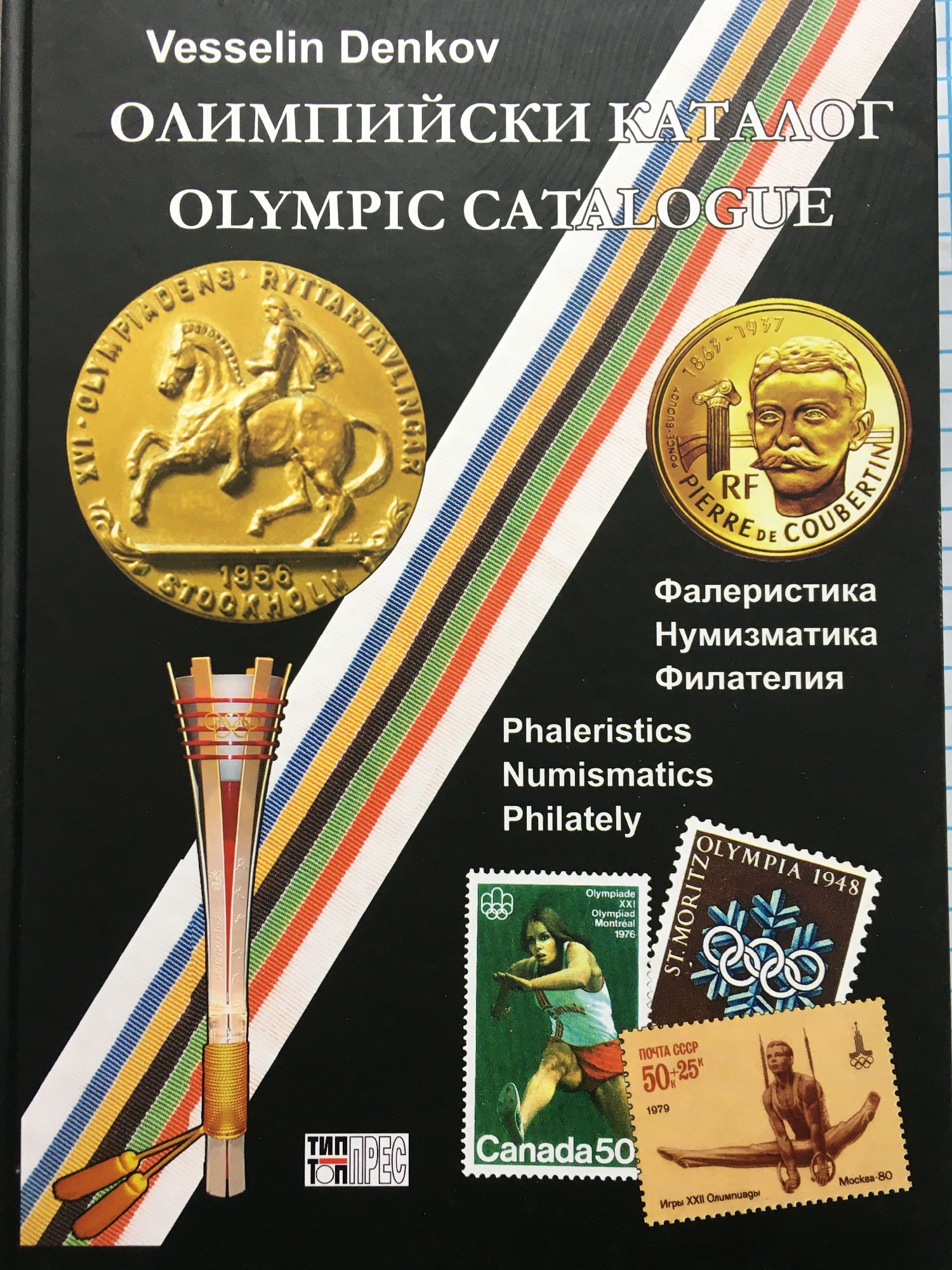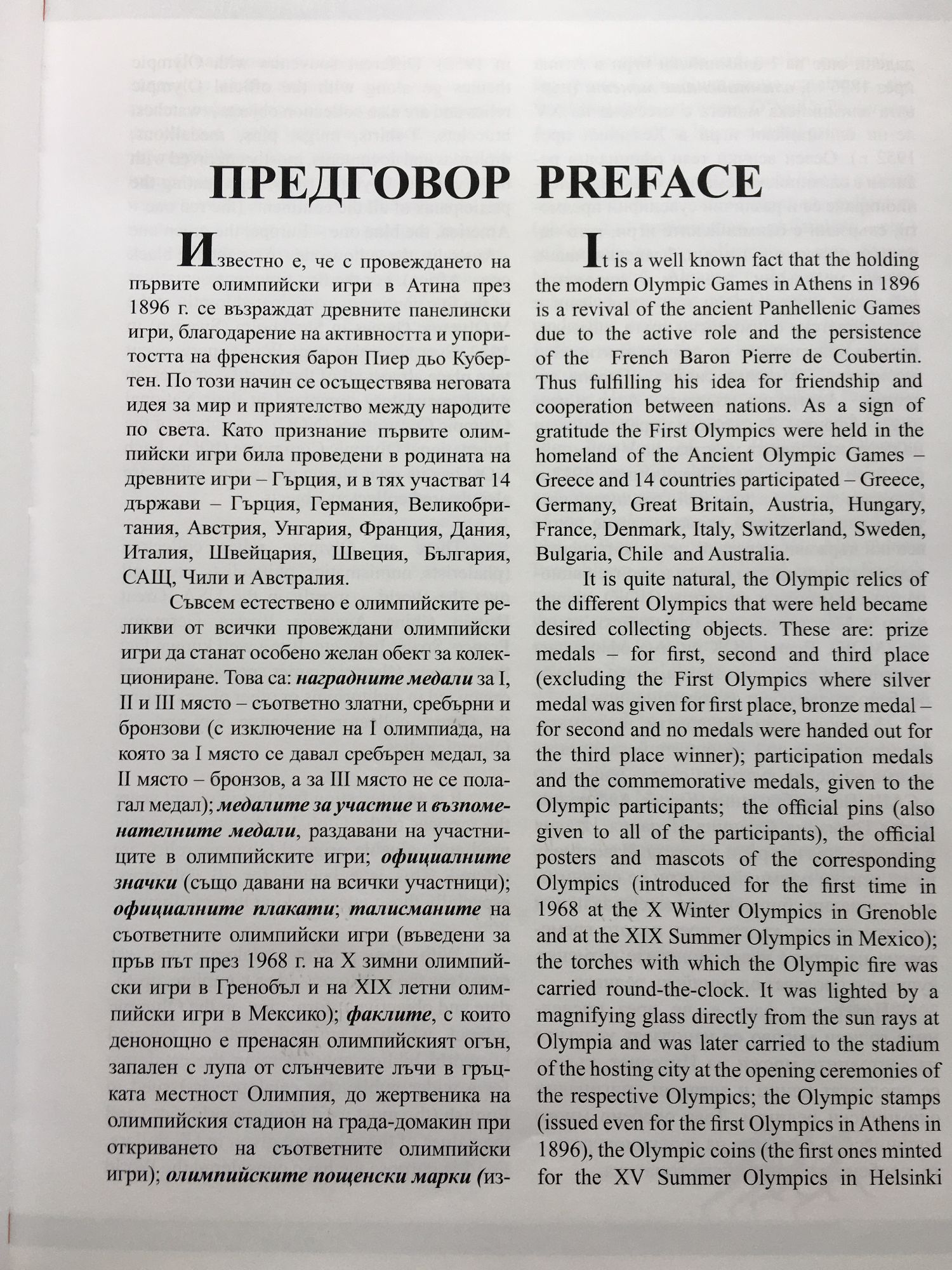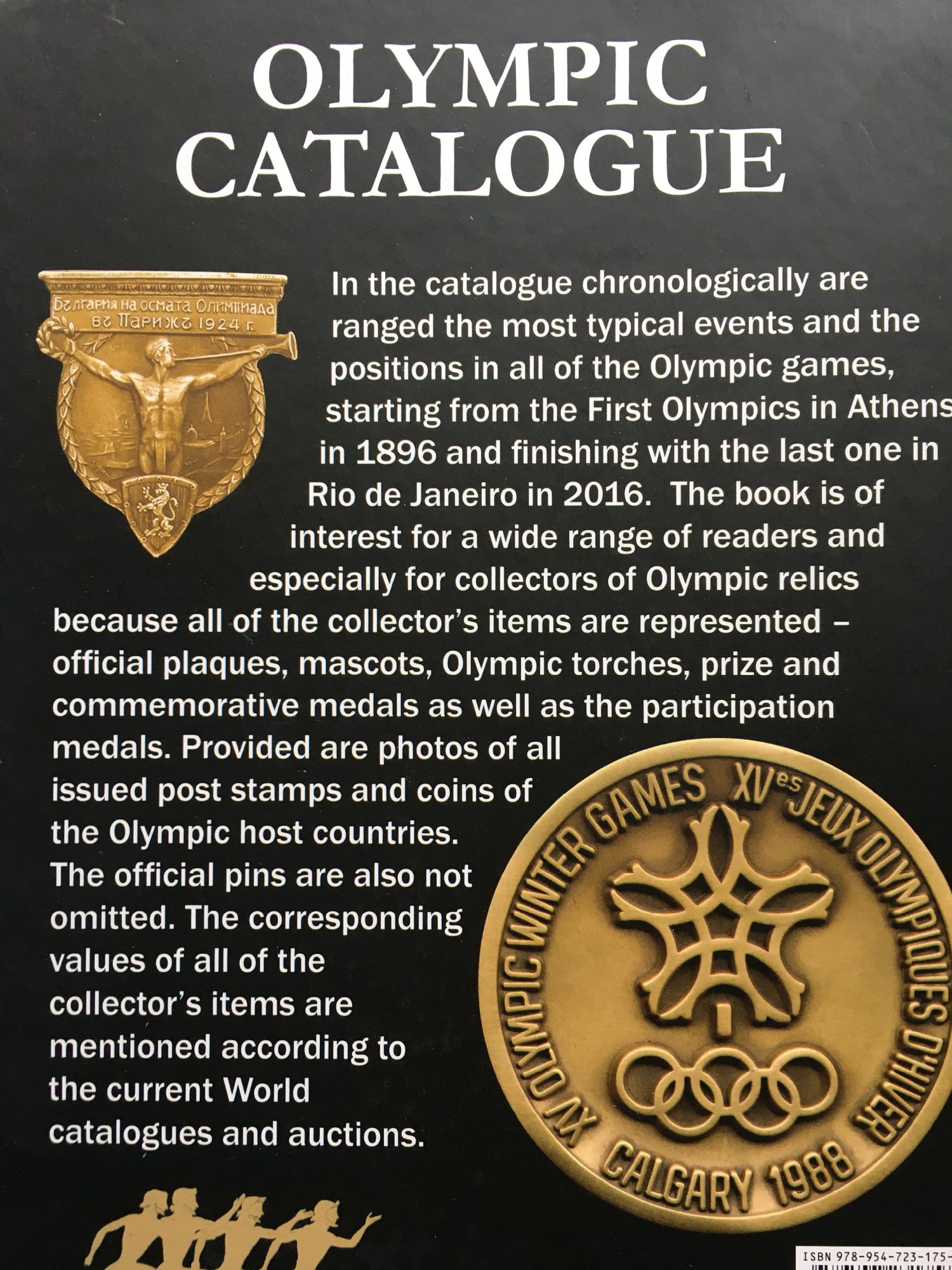 Известно е, че с провеждането на първите олимпийски игри в Атина през 1896 г. се възраждат древните панелински игри, благодарение на активността и упоритостта на френския барон Пиер дьо Кубертен. По този начин се осъществява неговата идея за мир и приятелство между народите по света. Като признание първите олимпийски игри били проведени в родината на древните игри - Гърция, и в тях участват 14 държави - Дърция, Германия, Великобритания, Австрия, Унгария, Франция, Дания, Италия, Швейцария, Швеция, България, САЩ, Чили и Австралия. С настоящия каталог си поставихме за задача да дадем цялостна актуална и обективна информация на олимпийска тематика, която е доста оскъдна в световната литература. За да бъде достъпен каталогът, го издадохме и на английски език, а стойностите на реликвите са представени в долари. In the catalogue chronologically are ranged the most typical events and the positions in all of the Olympic games, starting from the First Olympics in Athens in 1896 and finishing with the last one in Rio de Janeiro in 2016. The book is of interest for a wide range or readers and especially for collectors of Olympic relics because all of the collector's items are represented - official plaques, mascots, Olympic torches, prize and commemorative medals as well as the participation medals. Provided are photos of all issued post stamps and coins of the Olympic host countries. The official pins are also not omitted. The corresponding values of all the collector's items are mentioned according to the current World catalogues and auctions.