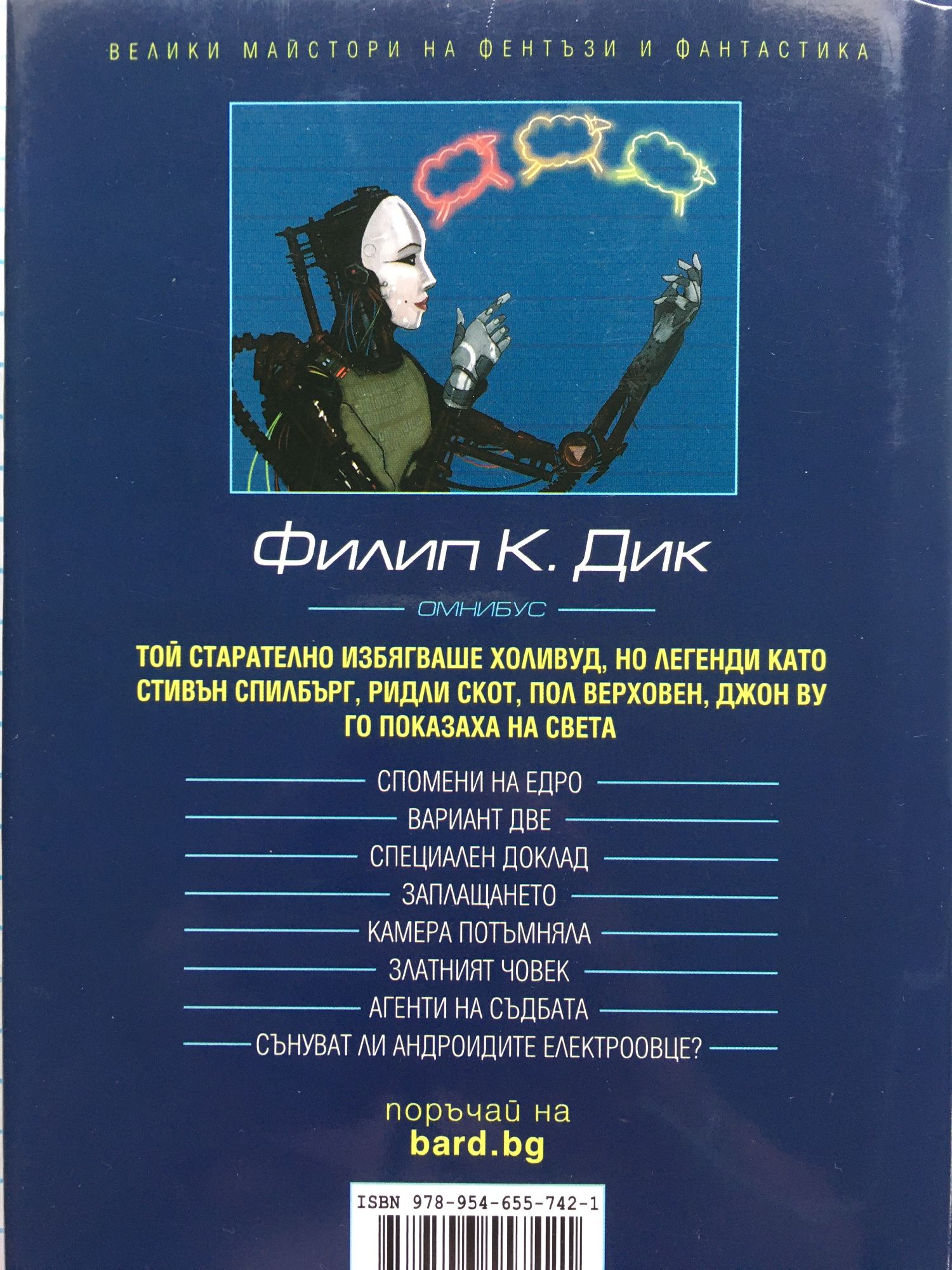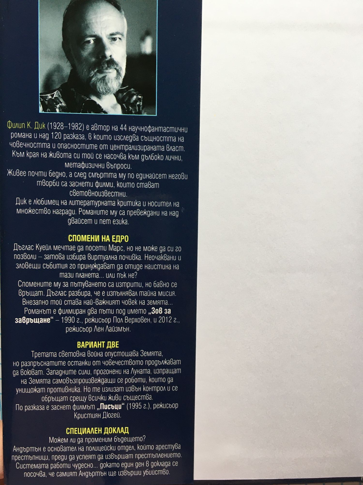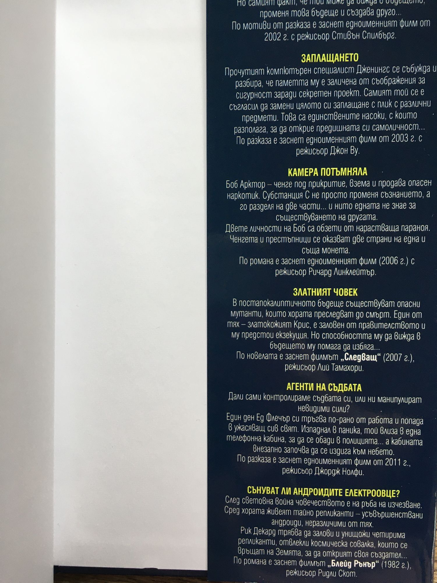 * Спомени на едро Дъглас Куейл мечтае да посети Марс, само че не може да си го позволи - затова избира виртуална почивка. Но неочаквани и зловещи събития го принуждават да отиде наистина на тази планета... или пък не? Съзнателните му спомени за пътуването са изтрити, но бавно се връщат. Дъглас разбира, че е изпълнявал тайна мисия. Внезапно той става най-важният човек на земята... По романа е заснет филмът „Зов за завръщане“ (1990 г.), режисьор Пол Верховен. * Вариант две Третата световна война опустошава Земята, но разпръснатите останки от човечеството продължават да воюват. Западните сили, прогонени на Луната, изпращат на Земята самовъзпроизвеждащи се роботи, които да унищожат противника. Но те излизат извън контрол и се обръщат срещу всички живи същества. По разказа е заснет филмът „Писъци“ (1995 г.), режисьор Кристиян Дюгей. * Специален доклад Можем ли да променим бъдещето? Андертън е основател на полицейски отдел, който арестува престъпници, преди да успеят да извършат престъплението. Системата работи чудесно... докато един ден в доклада се посочва, че самият Андертън ще извърши убийство. Но самият факт, че той може да вижда в бъдещето, го променя и създава друго бъдеще... По мотиви от разказа е заснет едноименният филм от 2002 г. с режисьор Стивън Спилбърг. * Заплащането Прочутият компютърен специалист Майкъл Дженингс се събужда и разбира, че паметта му е заличена от съображения за сигурност заради секретен проект. Самият той се е съгласил да замени цялото си заплащане с плик с различни предмети. Това са единствените насоки, с които разполага, за да открие предишната си самоличност... По разказа е заснет едноименният филм от 2003 г. с режисьор Джон Ву. * Камера потъмняла Боб Арктър – ченге под прикритие, взема и продава опасен наркотик. Субстанция D не просто променя съзнанието, а го разделя на две части... и нито едната не знае за съществуването на другата. Двете личности на Боб са обзети от нарастваща параноя. Ченгета и престъпници се оказват две страни на една и съща монета. По романа е заснет едноименният филм (2006 г.) с режисьор Ричард Линклейтър. * Златният човек В постапокалиптичното бъдеще съществуват опасни мутанти, които хората преследват до смърт. Един от тях - златокожият Крис, е заловен от правителството и му предстои екзекуция. Но способността му да вижда в бъдещето му помага да избяга... По новелата е заснет филмът „Следващ“ (2007 г.), режисьор Лий Тамахори. * Агенти на съдбата Дали сами контролираме съдбата си, или ни манипулират невидими сили? Един ден Ед Флечър си тръгва по-рано от работа и попада в ужасяващ сив свят. Изпаднал в паника, той влиза в една телефонна кабина, за да се обади в полицията... а кабината внезапно започва да се издига към небето. По разказа е заснет едноименният филм от 2011 г., режисьор Джордж Нолфи. * Сънуват ли андроидите електроовце След световна война човечеството е на ръба на изчезване. Сред хората живеят тайно репликанти –усъвършенствани андроиди, неразличими от тях. Рик Декард трябва да залови и унищожи четирима репликанти, отвлекли космическа совалка, които се връщат на Земята, за да открият своя създател... По романа е заснет филмът „Блейд Рънър“ (1982 г.), режисьор Ридли Скот.
