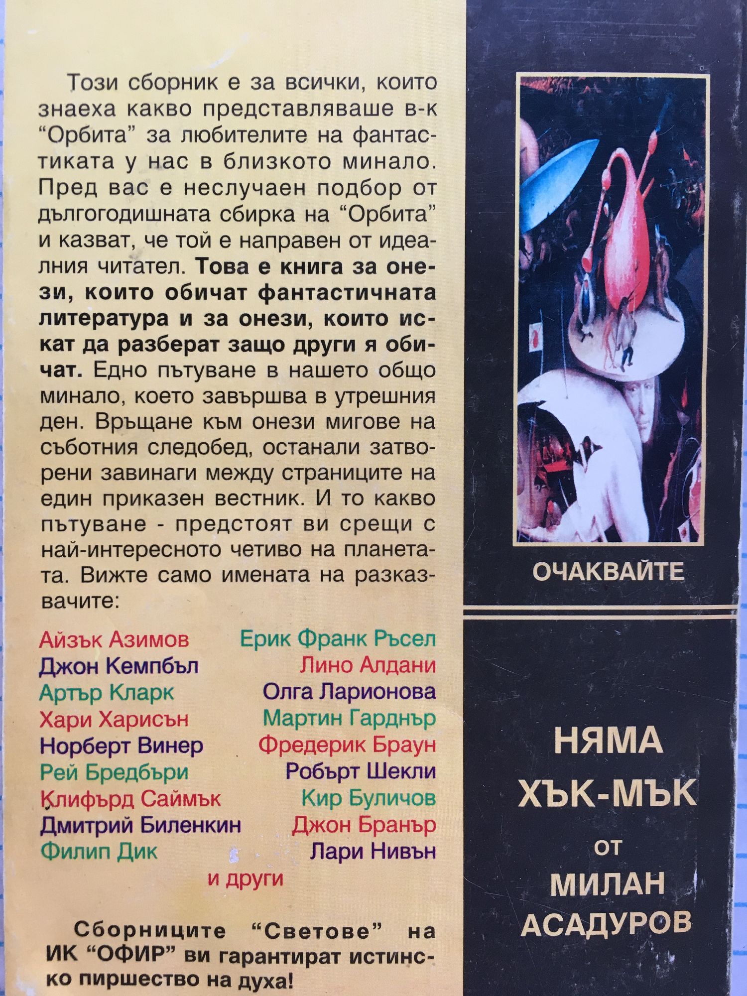 Този сборник е за всички, които знаеха какво представляваше вестник „Орбита“ за любителите на фантастиката у нас в близкото минало. Пред вас е неслучаен подбор от дългогодишната сбирка на „Орбита“ и казват, че той е направен от идеалния читател. Това е книга за онези, които обичат фантастичната литература и за онези, които искат да разберат защо други я обичат. Едно пътуване в нашето общо минало, което завършва в утрешния ден. Връщане към онези мигове на съботния следобед, останали затворени завинаги между страниците на един приказен вестник. И то какво пътуване — предстоят ви срещи с най-интересното четиво на планетата. Вижте само имената на разказвачите: Айзък Азимов, Джон Кемпбъл, Артър Кларк, Хари Харисън, Норберт Винер, Рей Бредбъри, Клифърд Саймък, Дмитрий Биленкин, Филип Дик, Ерик Франк Ръсел, Лино Алдани, Олга Ларионова, Мартин Гарднър, Фредерик Браун, Робърт Шекли, Кир Буличов, Джон Бранър, Лари Нивън и др. Сборниците „Светове“ на ИК „Офир“ ви гарантират истинско пиршество на духа!