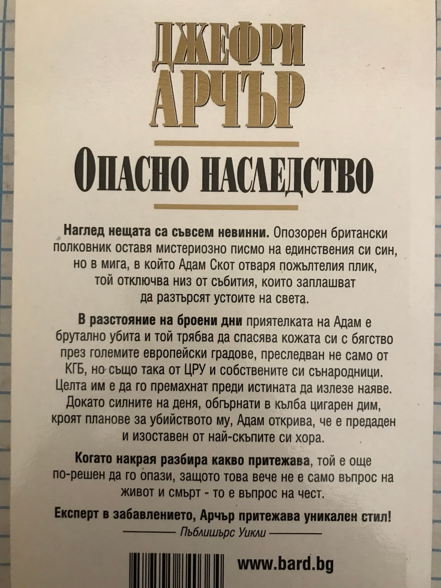 Нагорещен до червено роман, чиято скорост би свалила боята на космически кораб! Ню Йорк Таймс Бук Ривю ОПАСНО НАСЛЕДСТВО Наглед нещата са съвсем невинни. Опозорен британски полковник оставя мистериозно писмо на единствения си син, но в мига, в който Адам Скот отваря пожълтелия плик, той отключва низ от събития, които заплашват да разтърсят устоите на света. В разстояние на броени дни приятелката на Адам е брутално убита и той трябва да спасява кожата си с бягство през големите европейски градове, преследван не само от КГБ, но също така от ЦРУ и собствените си сънародници. Целта им е да го премахнат преди истината да излезе наяве. Докато силните на деня, обгърнати в кълба цигарен дим, кроят планове за убийството му, Адам открива, че е предаден и изоставен от най-скъпите си хора. Когато накрая разбира какво притежава, той е още по-решен да го опази, защото това вече не е само въпрос на живот и смърт - то е въпрос на чест. Необуздан, непознаващ ограничения експлозивен и лудешки трилър! Бъфало Нюз Експерт в забавлението, Арчър притежава уникален стил! Пъблишърс Уикли