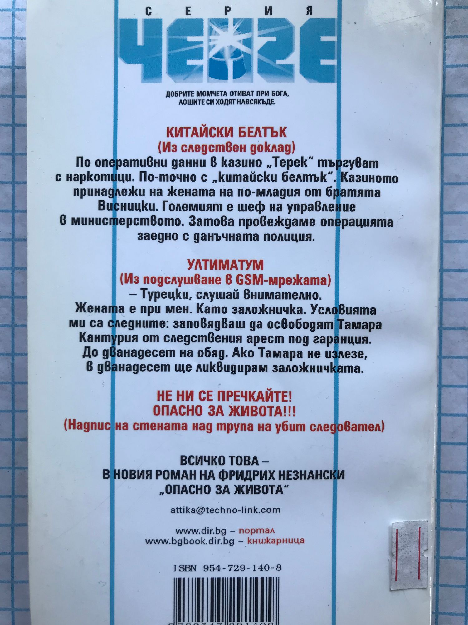 КИТАЙСКИ БЕЛТЪК (Из следствен доклад) По оперативни данни в казино „Терек" търгуват с наркотици. По-точно с „китайски белтък". Казиното принадлежи на жената на по-младия от братята Висницки. Големият е шеф на управление в министерството. Затова провеждаме операцията заедно с данъчната полиция.