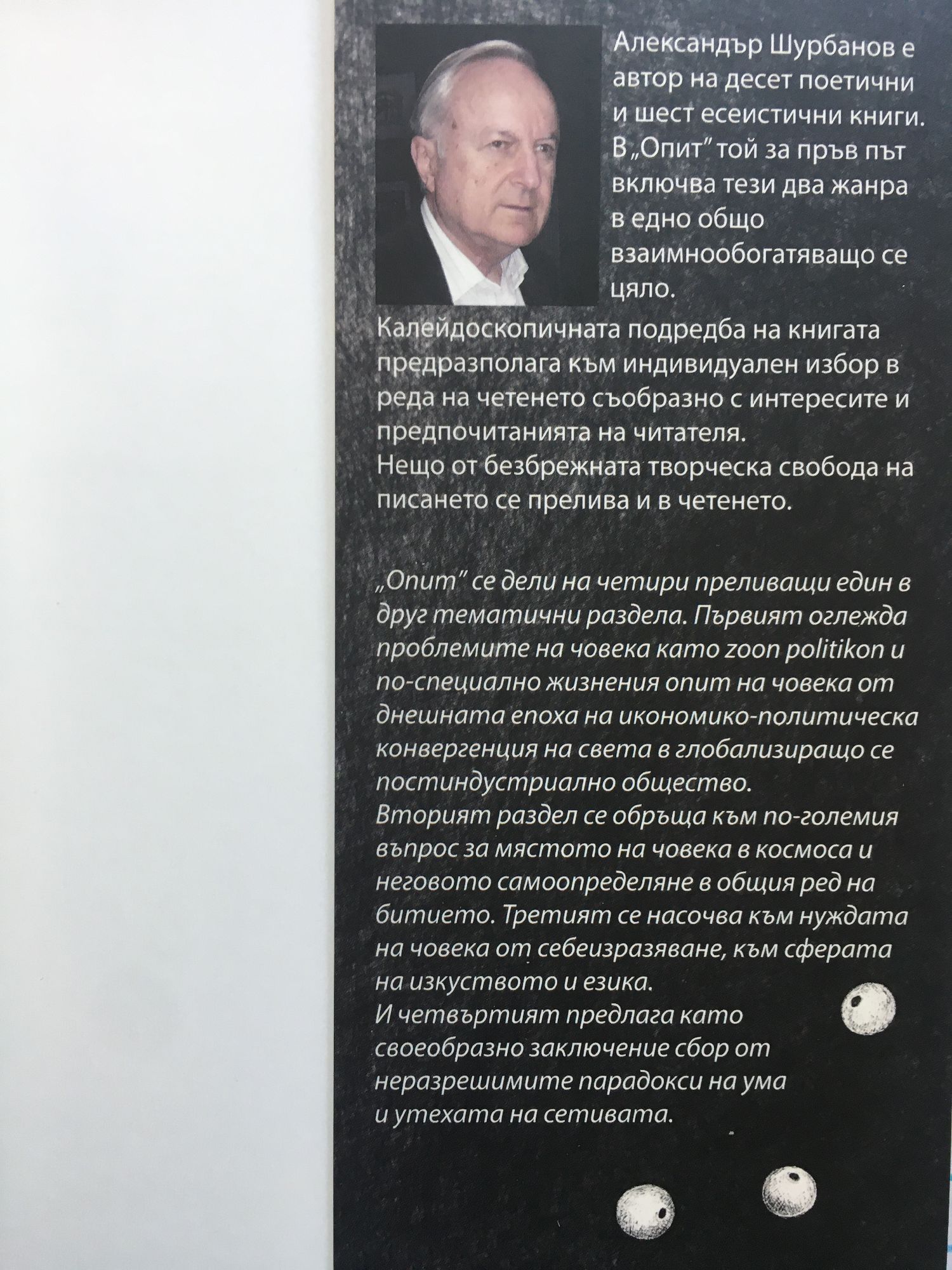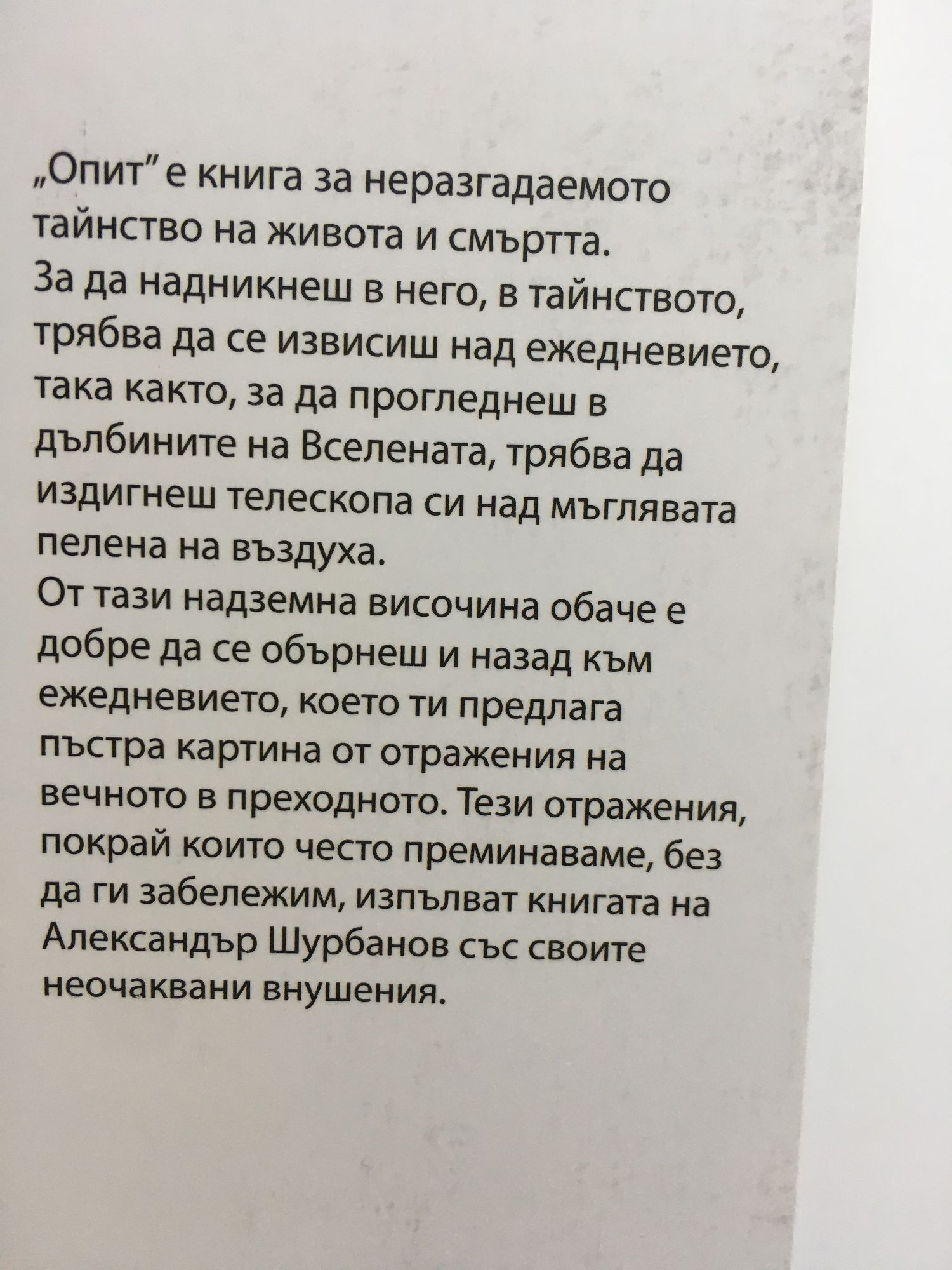 „Опит” е книга за неразгадаемото тайнство на живота и смъртта. За да надникнеш в него, в тайнството, трябва да се извисиш над ежедневието, така както, за да прогледнеш в дълбините на Вселената, трябва да издигнеш телескопа си над мъглявата пелена на въздуха. От тази надземна височина обаче е добре да се обърнеш и назад към ежедневието, което ти предлага пъстра картина от отражения на вечното в преходното. Тези отражения, покрай които често преминаваме, без да ги забележим, изпълват книгата на Александър Шурбанов със своите неочаквани внушения. „Опит” се дели на четири преливащи един в друг тематични раздела. Първият оглежда проблемите на човека като zoon politikon и по-специално жизнения опит на човека от днешната епоха на икономико-политическа конвергенция на света в глобализиращо се постиндустриално общество. Вторият раздел се обръща към по-големия въпрос за мястото на човека в космоса и неговото самоопределяне в общия ред на битието. Третият се насочва към нуждата на човека от себеизразяване, към сферата на изкуството и езика. И четвъртият предлага като своеобразно заключение сбор от неразрешимите парадокси на ума и утехата на сетивата.